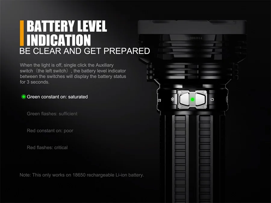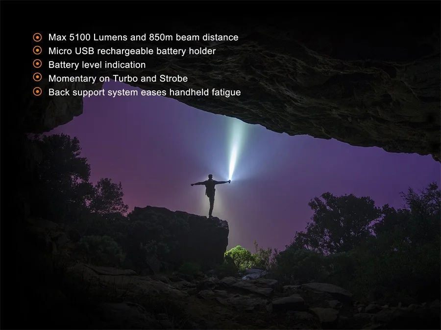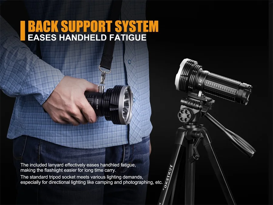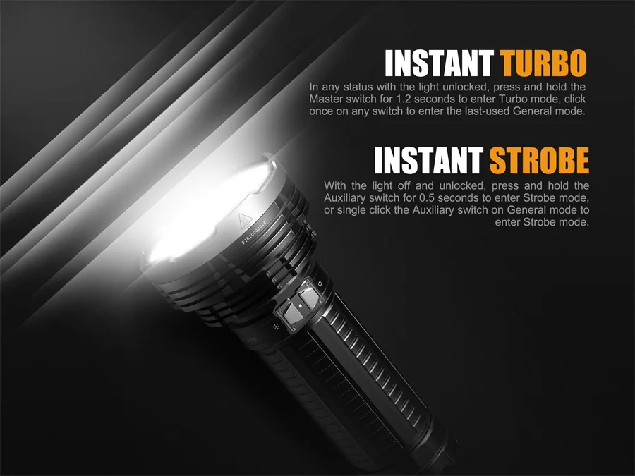 Описание товара Fenix TK75 2018 Edition-перезаряжаемый фонарик с удивительным сочетанием 5100 люменов с максимальным выходом и 2,788.71 футов/850 м максимальным расстоянием луча. Инновационный держатель аккумуляторной батареи поставляется с портом Micro USB, а Fenix TK75 питается от четырех аккумуляторов 18650. Оснащенный четырьмя светодиодами Cree XHP35 HI, фонарик TK75 2018 имеет дальность мощности и универсальность, чтобы удовлетворить различные требования к освещению, такие как поиск, закрепление, спеление и многое другое. Двойные переключатели из нержавеющей стали обеспечивают удобный выбор на выходе из шести уровней яркости и двух режимов вспышки мгновенного Турбо и стробоскопа. Функция блокировки предотвращает возможность непредвиденной работы фонарика. Кроме того, встроенный разъем, который может взять либо плечевой ремень, либо крепление штатива для переноски или крепления, делает Fenix TK75 еще более выгодным и надежным в поиске, закреплении, спелении, И в качестве освещения в режиме ожидания для автомобилей. Технические характеристики Четыре CREE XHP35 HI светодиодный's со сроком службы 50000 часов Питание от четырех аккумуляторов 18650 или четырех CR123A's (для чрезвычайных ситуаций) 6 различных режимов плюс стробоскоп и SOS Турбо-5100 люменов (2 ч. 15 мин.) Высокая II - 2000 люменов (3 ч.) Высокая I - 1000 люменов (6 ч.) Средний-450 люменов (17 ч. 45 мин.) Низкий-150 люменов (46 часов) Эко-50 люменов (95 ч.) Стробоскоп-5100 люменов SOS - 150 люменов Переноска аккумуляторной батареи Micro USB (не совместима с CR123A's) Мгновенный турбо и стробоскоп Многофункциональное гнездо штатива Индикатор уровня заряда батареи Цифровой выход: поддерживает постоянную яркость Функция блокировки от случайной активации Интеллектуальная схема памяти Схема защиты от перегрузки Аккумуляторы Рекомендуемые батареи: 4 литий-ионных аккумулятора Fenix 18650 или 8 батарей CR123A Рекомендуемые зарядные устройства: Зарядные устройства Fenix * Батарейки в комплект не входят/требуются 4 батарейки 18650 * В комплекте Fenix TK75 светодиодный фонарик (2018) Плечевой ремень Ремешок Два запасных уплотнительных кольца Пластиковый чехол Руководство пользователя TK75 Гарантийный талон