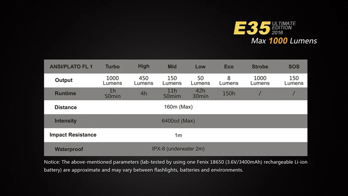 Fenix оснащен этим устройством с технологически продвинутым CREE XM-L2 U2 Светодиодный индикатор для наилучших выходов. Одиночный боковой переключатель позволяет включать и выключать светильник и циклы через режимы вывода. E35 имеет режим Eco 8 люмен вплоть до турбо-режима 1000 люмен-больше нет режима Burst. Это один из самых мощных ярких фонарей на рынке. Он сделал имя для себя, чтобы быть надежным и прямым инструментом освещения.
