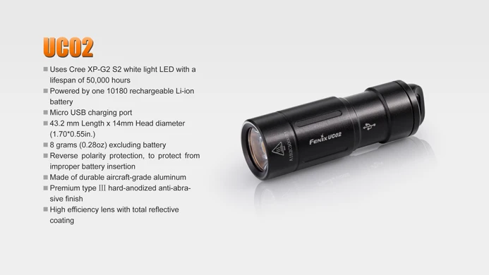 Описание Fenix LD09 использует интеллектуальную схему привода, для совместимости с одной перезаряжаемой литий-ионной батареей 14500, она обеспечивает максимальный выход 220 люменов, имеет 3 уровня яркости Плюс SOS. Тактический задний переключатель одной руки подчеркивает компактный размер корпуса для удобной работы. Как EDC фонарик интегрирует высокую производительность и долгое время работы в режиме ожидания, это должно быть незаменимым компаньоном не только для вас, но и для вашей семьи и друзей. Особенности Светодиодные фонари для подводной охоты Cree XP-E2 (R3) светодиодный со сроком службы 50000 часов · Питание от одного литий-ионного аккумулятора 14500 или одного 1,5 V AA (никель-металл-гидридный аккумулятор с щелочной) батарея · 94 мм (3,7 дюйма) длина × 19 мм (0,7 дюйма) диаметр · 35 г (1,2 унций) без батареи · Интеллектуальная схема привода для более высокой производительности батареи · Цифровой регулируемый выход поддерживает постоянную яркость · Защита от обратной полярности, Защита от неправильной установки батареи · Защита от перегрева, чтобы избежать высокой температуры поверхности · Тактический задний переключатель для операции с одним ключом · Изготовлен из прочного авиационного алюминия · Премиум Тип III Жесткий анодированный анти-абразивный финиш · Закаленное ультрапрозрачное стекло с антибликовым покрытием Описание Fenix UC02-это перезаряжаемый брелок-фонарик с невероятно небольшим размером корпуса. От одного литий-ионного аккумулятора 10180, он обеспечивает максимальную мощность 130 люменов. Два уровня выхода и IPX-8 водонепроницаемой классификации делают UC02 надежным и полезным EDC инструментом освещения. Особенности · Использует Cree XP-G2 S2 белый светильник светодиодный со сроком службы 50000 часов · Питание от одного литий-ионного аккумулятора 10180 · Порт зарядки Micro USB · 43,2 мм длина x 14 мм диаметр головки (1,70*0,55 дюйма) · 8 граммов (0,28 унций) без батареи · Защита от обратной полярности, Защита от неправильной вставки батареи · Изготовлен из прочного авиационного алюминия · Премиум Тип Ⅲ Жесткий анодированный анти-абразивный финиш · Высокая эффективность линзы с полным отражающим покрытием Входит в посылка LD09 flashlight× 1 UC02 синий flashlight× 1 AA аккумулятор × 1 Holster× 1 Lanyard× 1 Запасное уплотнительное кольцо x 2 Руководство пользователя x 2 Гарантийный талон x 1