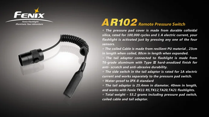 Дистанционный переключатель давления Fenix специально разработан для тактических фонарей-три датчика, подключенные параллельно модулю пружинных стальных переключателей для легкой надежной активации. Фонарик активируется при небольшом пальцевом давлении на выключатель, и как только давление выключается, фонарик выключается. Кабель 80 см (максимальная длина) обеспечивает дистанционное управление фонариком, что делает его более гибким и удобным для вашей тактической Миссии или охоты.