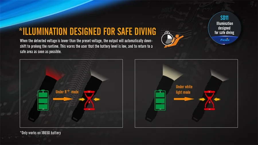 Описание товара Представляем новейший погружной светильник от Fenix, SD11. Этот Fenix SD11 предназначен в основном для подводной фотографии и видеосъемки. Он оснащен Cree XM-L2 U2 нейтральный белый светодиодный и Cree XQE красный светодиодный. Благодаря мягкому широкому пучку и инновационному режиму R + для лучшей цветопередачи SD11 подходит для освещения и фотографии на берегу или в воде. Будь то глубоководные исследования или охота/наблюдение за подводной ночной жизнью, фонарик SD11 создан для всех занятий дайвингом. Нужна глубина от погружения светильник? С SD11 вы получаете оценку глубины 332 футов. Максимальный белый светильник 1000 люменов и красный светильник 250 люменов производятся из одного аккумулятора 18650. Дополнительной особенностью является управление одной рукой. Просто поверните голову, чтобы получить доступ к трем режимам освещения. SD11 обязательно будет ваш светильник для всех ваших приключений под водой. Технические характеристики Использует Cree XM-L2 нам нейтральный белый светодиодный и Cree XQE красный светодиодный со сроком службы 50000 часов Режимы выхода: Белый светильник-высокий: 1000 люменов (2 часа. И расстояние луча 147 футов) Белый светильник-низкий: 500 люменов (3 часа. 40 мин и 98 футов расстояние луча) Красный светильник-250 люменов (3 часа. И расстояние луча 75 футов) Вращающееся магнитное кольцо для управления одной рукой Двухслойная Защита корпуса от коррозии Увеличенное отверстие для шнурка для быстрого крепления Интегрированный белый и красный светильник Цифровой регулируемый выход поддерживает постоянную яркость Интеллектуальная защита от перегрева, чтобы избежать высокой температуры поверхности Предупреждение о низком напряжении напоминает о необходимости замены батареи Защита от обратной полярности, Защита от неправильной установки батареи Задняя крышка с большой пряжкой для быстрой и удобной быстрой вытяжки Изготовлен из прочного авиационного алюминия Премиум Тип III Жесткий анодированный анти-абразивный финиш Закаленное ультрапрозрачное стекло с антибликовым покрытием Водонепроницаемость до 332 футов (100 метров) Нажмите здесь для получения инструкции по эксплуатации. Использованные батареи (не входят в комплект) Одна аккумуляторная батарея 18650 (принимает Fenix ARB-L18-2600, ARB-L18-2600U, ARB-L18-2900, ARB-L18-3500 или ARB-L18-3500U и Tenergy). Каждый из них имеет различную мАч. Чем выше мА · ч, тем дольше время работы между зарядами. Совместимые зарядные устройства для всех аккумуляторов 18650: ARE-X1, ARE-X1 +, ARE-X2 или ARE-C2 + Вам может быть интересен этот ARE-X11 комплект для зарядки Две неперезаряжаемые батареи CR123A. (Fenix не рекомендует аккумуляторы CR123, так как они не будут работать в соответствии с таблицей спецификаций, включенной для SD11.) Размер вашего светильник Длина: 5,43 дюйма (138 мм) Диаметр корпуса: 1,02 дюйма (26 мм) Диаметр головки: 1,34 дюйма (34 мм) Вес: 4,67 унций (132,5 г) Что входит в ваш светильник Фонарик 1 - SD11 1-зажим для фонарика и крепление для камеры 1-кольцо 1 ремень для дайвинга 2-запасное уплотнительное кольцо 1-Руководство пользователя 1-гарантийный талон