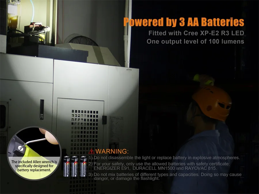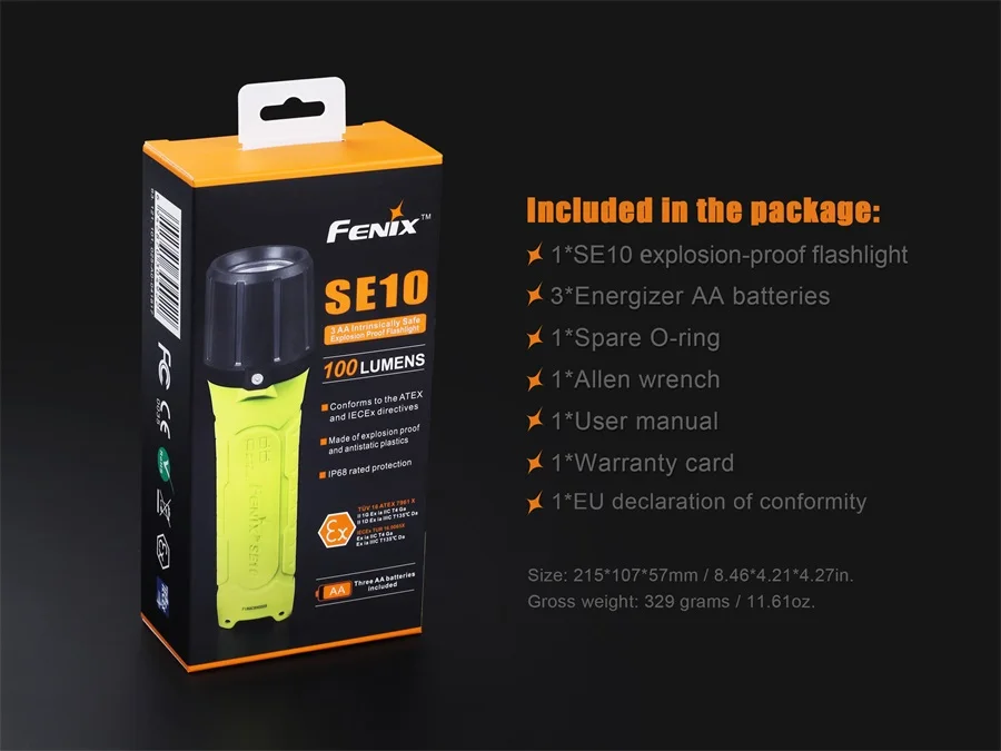 Описание SE10 является неразрывно безопасным взрывозащищенным фонариком в группе II категории I, предназначенным для всех районов, подверженных опасности взрыва, за исключением мин. Он соответствует директиве ATEX, которая признана на международном уровне авторитетными взрывобезопасными организациями. Изготовлен из взрывозащищенного и Антистатического пластика, он соответствует требованиям к взрывозащищенному дизайну. Этот фонарик может быть использован в среде зон воспламеняющихся газов 0-2 и в атмосферу зон легковоспламеняющейся пыли 20-22. Кроме того, он достиг II 1G Ex ia IIC T4 Ga / II 1D Ex ia IIIC T135 ℃ Da Взрывозащищенная классификация, это означает, что он может использоваться в легковоспламеняющихся и взрывоопасных отраслях, включая металлургические заводы, электростанции, текстильную, бумажную и химическую промышленность и места, включая нефтяные месторождения, железные дороги и нефтехимические заводы. Этот фонарик будет надежным средством в легковоспламеняющихся и взрывоопасных условиях. Особенности · Неразрывно безопасный взрывозащищенный фонарик с директивой ATEX и IEC II 1G Ex ia IIC T4 Ga / II 1D Ex ia IIIC T135 ℃ Da взрывозащищенные классификации · Использует Cree XP-E2 R3 светодиодный со сроком службы 50000 часов · Питание от трех аккумуляторов AA/1,5 V · 177,5 мм длина x 53 мм ширина x 51 мм высота · Вес: 164 г (без батарей) · Физическая защита от обратной полярности, для защиты от неправильной вставки батареи · Включает выделенный шестигранный ключ · Тактический задний переключатель для мгновенной и постоянной активации · Изготовлен из взрывозащищенного и Антистатического пластика Входит в посылка Взрывозащищенный фонарик SE10 x 1 Аккумуляторы типа аа Energizer x 3 Запасное уплотнительное кольцо x 1 Шестигранный ключ x 1 Руководство пользователя x 1 Гарантийный талон x 1 Декларация соответствия ЕС x 1