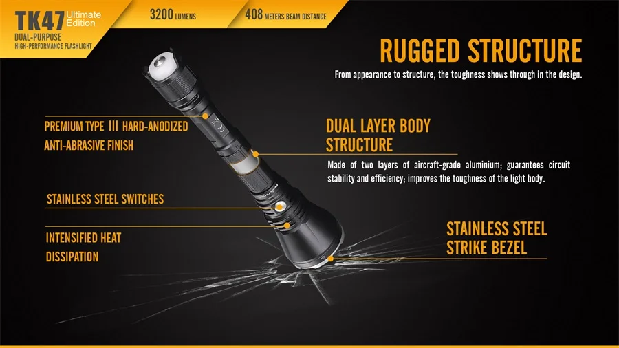 Описание товара Fenix TK47 UE тактический флэш-светильник из Fenix светильник является одним из Мощный тактический фонарь вспышка светильник. С максимальной мощностью 3200 люменов Этот зверь поможет вам увидеть все вокруг. Так как мы серии Fenix TK известны превосходными тактическими фонариками, но мы превзошли себя этим. Fenix TK47UE не только имеет большое количество люменов, но и имеет интегрированный многофункциональный задний переключатель. Этот светильник идеально подходит для тактических приложений в этой области, использовать его, чтобы увидеть на дальнем расстоянии или близкого расстояния с это orange отражатель, что делает его мощный потока Светодиодный светильник. В ночное время используйте его в качестве фонаря, конструкция позволяет выдержать светильник вспышки на голове и использовать задний переключатель как рассеянный светильник. Fenix TK47UE работает на двух батареях 18650, что позволяет достичь максимальной выходной мощности 3200 люменов на передней головке светодиодный индикатор и 30 люменов на заднем хвостовом переключателе. Не ждите, чтобы купить один раз из лучших тактических фонарей в наличии, получите ваш сегодня. Технические характеристики Задний фонарь использует Cree XHP70 светодиодный со сроком службы 50000 часов Задний светильник использует качественный Белый светодиодный, красный светодиодный Режимы выхода: Фара Турбо-3200 люменов (1 час-1339 футов/408 метров) Высокая-1000 люменов (3 часа 20 мин) Средний-350 люменов (11 часов 20 мин) Низкий-100 люмен (46 часов) Эко-20 люменов (170 часов) Стробоскоп-3200 люменов Задний светильник Белый светильник-30 люменов (43 часа 30 мин) Красный светильник-1,5 люменов (150 часов) Красная вспышка-1,5 люмен Красный S.O.S. -1,5 люмен Задний светильник имеет широкий диапазон 26,2 футов/8 м Диаметр луча Двойной независимый светильник, который может использоваться одновременно Задний светильник включает в себя диффузный дизайн, чтобы действовать как «Свеча светильник» для отдыха, чтения, кемпинга или сигнализации Изготовлен из прочного авиационного алюминия Премиум Тип III Жесткий анодированный анти-абразивный финиш Закаленное ультрапрозрачное стекло с антибликовым покрытием Ударный ободок из нержавеющей стали Переключатели из нержавеющей стали </spa Двухслойная структура корпуса Цифровой регулируемый выход поддерживает постоянную яркость Функция блокировки фар Защита от обратной полярности для защиты от неправильной вставки батареи Интеллектуальная защита от перегрева, чтобы избежать высокой температуры поверхности Интеллектуальная схема памяти-запоминает Последний уровень яркости, используемый в общем режиме Функция понижения низкого напряжения IP68 пыле-и водонепроницаемый Погружной до 6,6 Футов/2 м Аккумуляторы Рекомендуемые батареи: два литий-ионных аккумулятора Fenix 18650 Рекомендуемые зарядные устройства: Зарядные устройства Fenix * Батарейки в комплект не входят * батарейки CR123A не рекомендуется * Размер Длина: 10,5 в такой стране, как./266,2 мм Головка Диаметр: 2,4 в такой стране, как./61,5 мм Тела Диаметр: 1,1 в такой стране, как./28,6 мм В комплекте TK47UE фонарик Кобура Запасное уплотнительное кольцо Ремешок Руководство пользователя TK47 Гарантийный талон