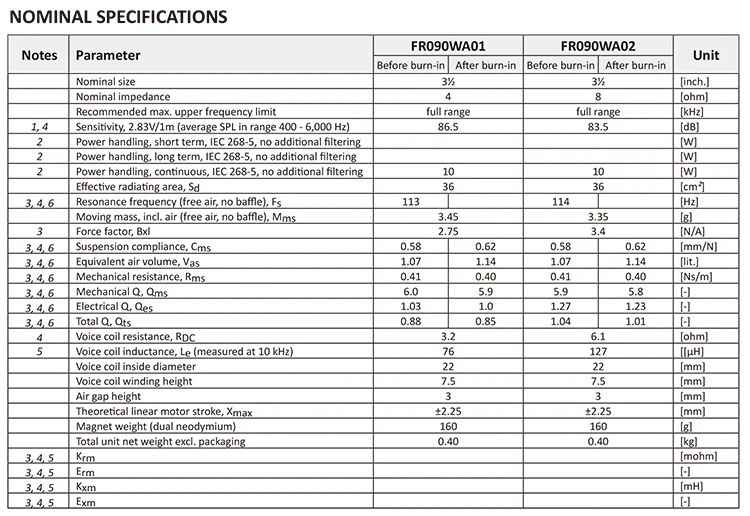 3,5 преобразователи FR090WA01 (4 Ом) и FR090WA02 (8 Ом) были разработаны специально для высококачественных мультимедийных и динамиков, где требуется воспроизведение звука без компромиссов, сохраняя при этом небольшой размер.