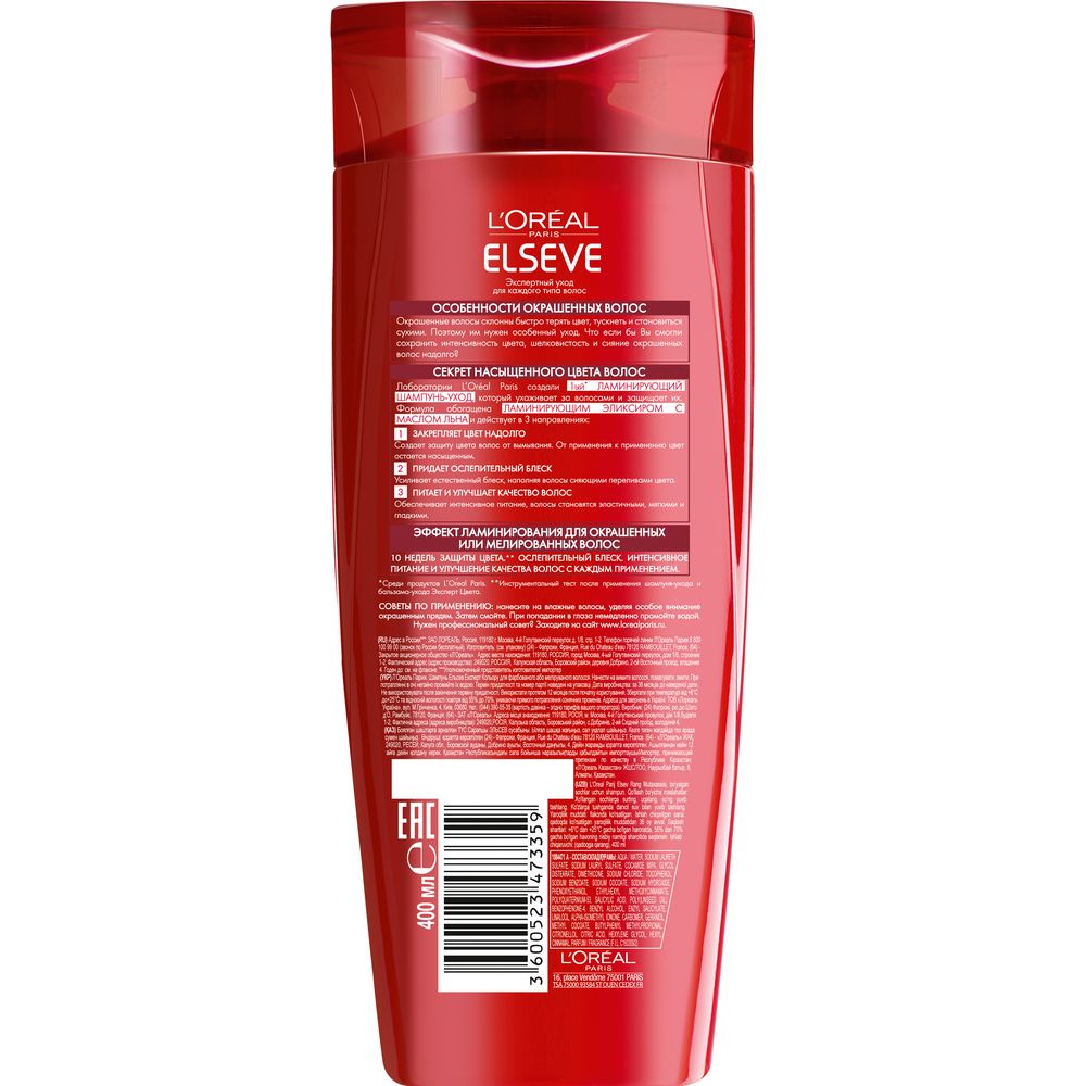 L'Oreal Paris Elseve Ламинирующий шампунь-уход "Эльсев, Эксперт Цвета", для окрашенных или мелированных волос, 400 мл