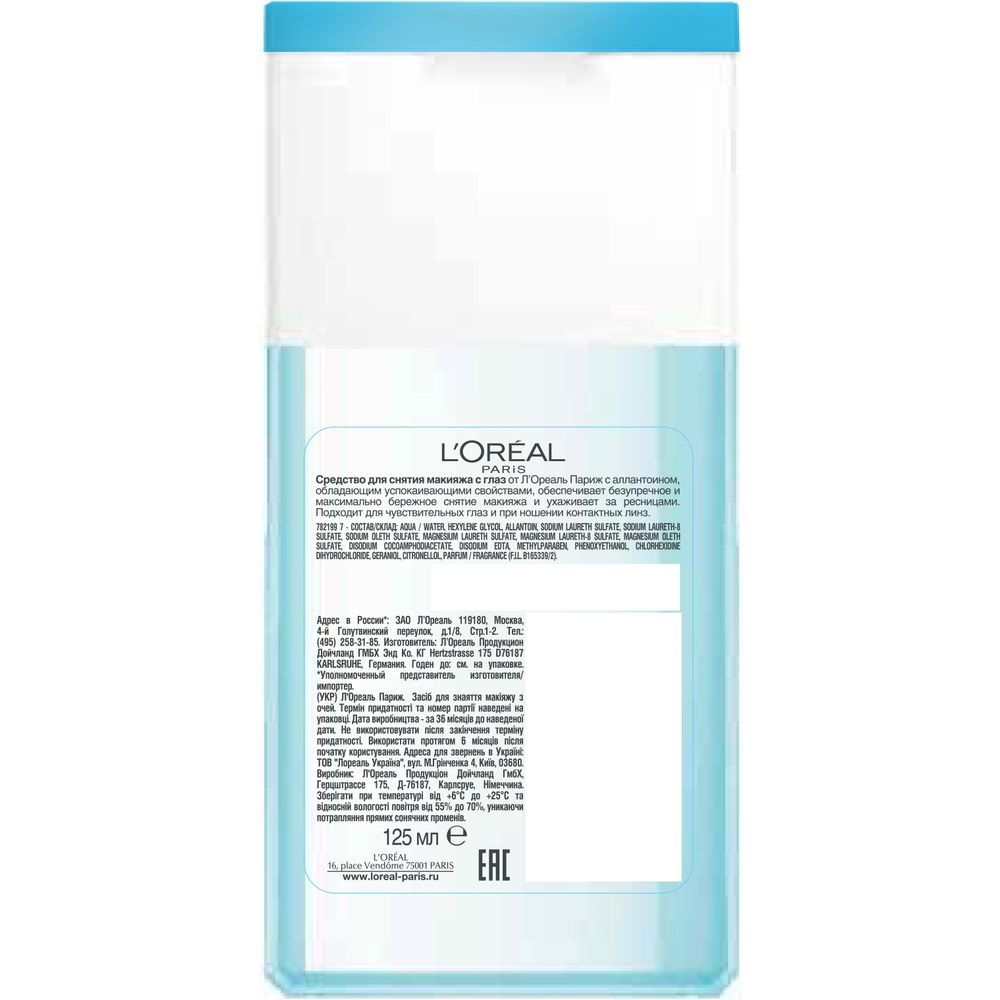 L'Oreal Paris Средство для снятия макияжа для чувствительных глаз,формула с про-витаминами,уход за ресницами,125мл