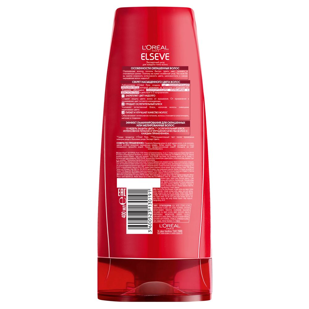 L'Oreal Paris Elseve Ламинирующий бальзам-уход "Эльсев, Эксперт Цвета", для окрашенных или мелированных волос, 400 мл