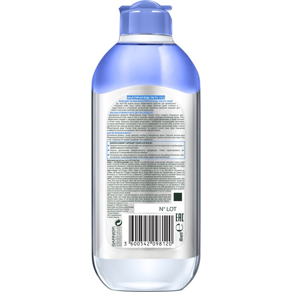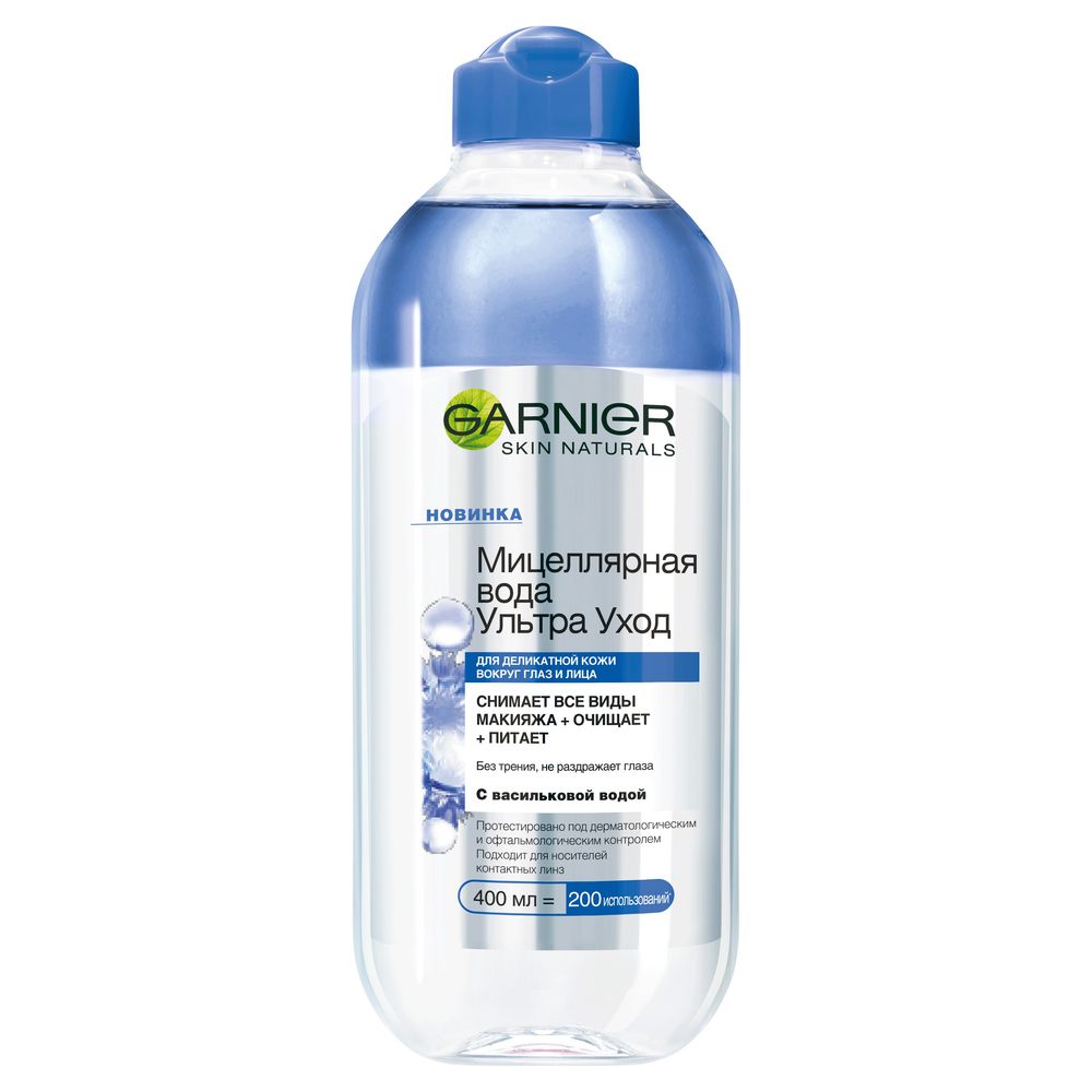 Garnier Мицеллярная вода Ультра Уход с васильковой водой, очищающее средство для лица, для деликатной кожи вокруг глаз и лица, 400 мл