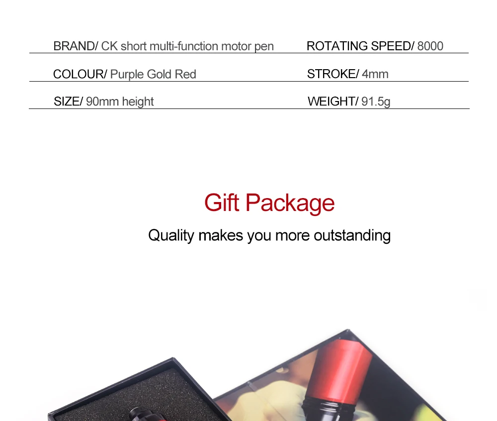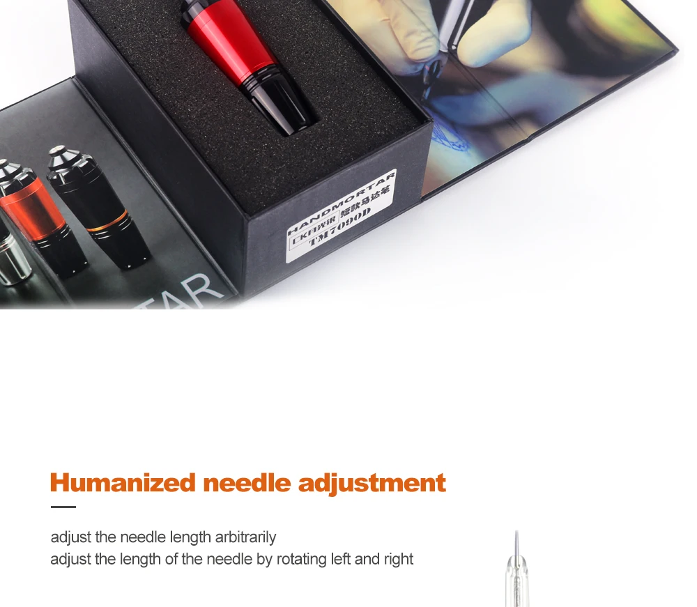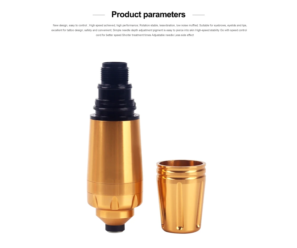 Рабочее напряжение: 7-10 В постоянного тока. Диапазон оборотов/сек: 8 в-8000 об/мин, 8-800 сек Ход поршня: 3 мм Выступ иглы: 0-3,5 мм Вес нетто: 310 г Эта роторная ручка машина подходит для большинства картриджей игл на рынке. Эта машина может использовать как подкладку, затенение и окраску. Сильный мотор и низкий уровень шума.
