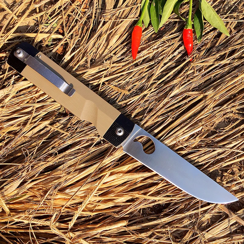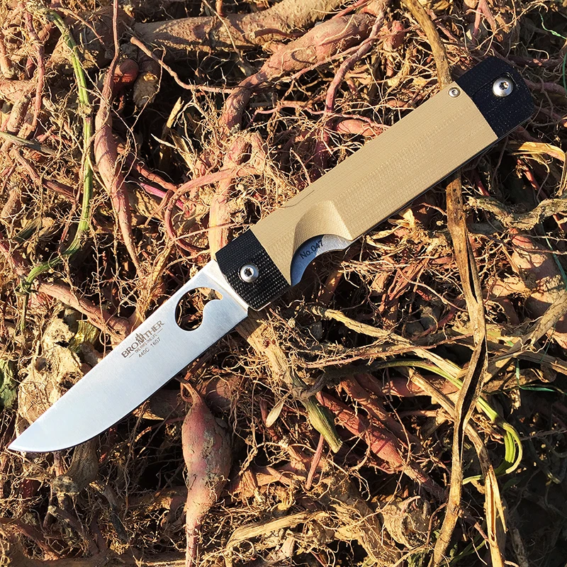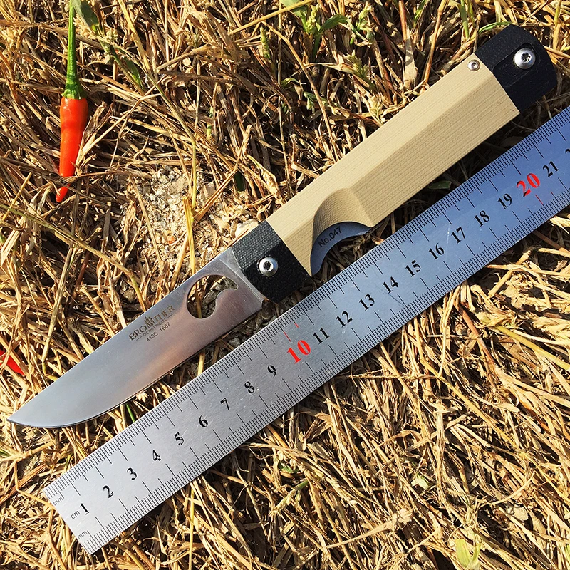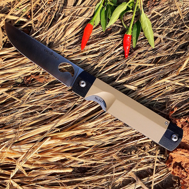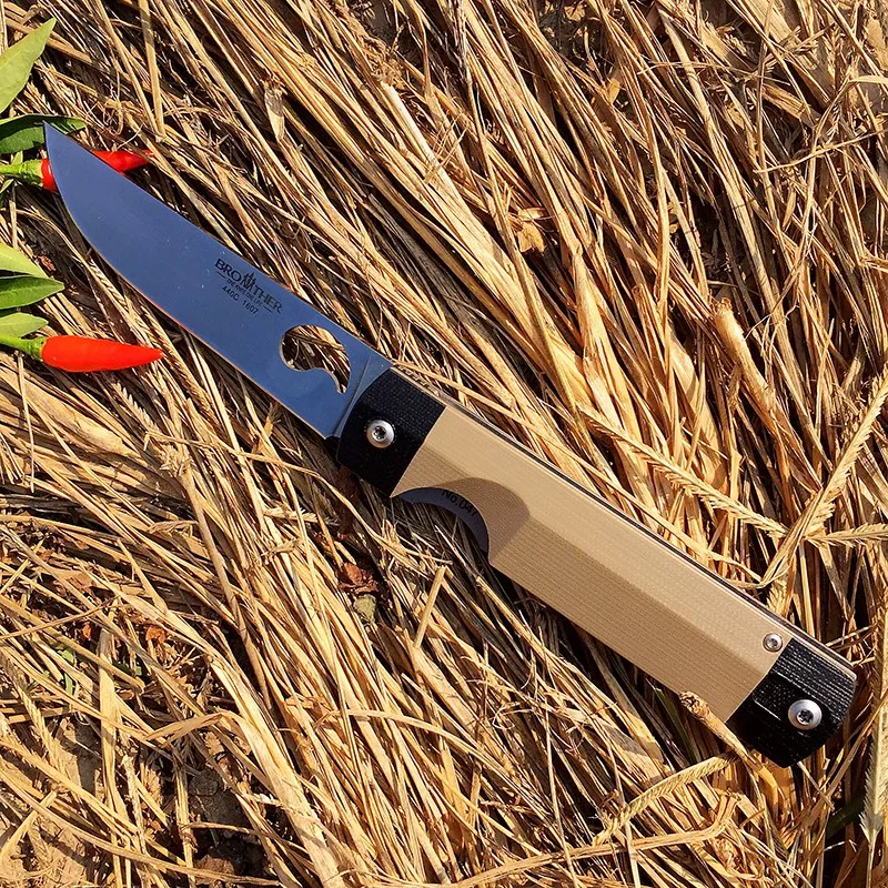Бренд: brother Код товара: 1607 Лезвие: 440C Ручка: G10 Полная длина: 223 мм Длина лезвия: 99 мм Толщина: 3,2 мм Поверхность: плоский Измельчитель. Атласная Отделка Твердость: 58-60HRC Вес ножа: 125 г