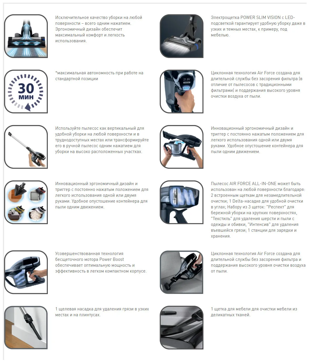 Универсальный пылесос Tefal TY9266WO для уборки на любых покрытиях. С ручкой: до 20 минут работы на стандартной позиции до 12 минут на повышенной мощности Без ручки: до 30 минут на стандартной позиции до 14 минут на повышенной мощности. Триггер удобно расположен для легкого использования и имеет позицию постоянного нажатия. В комплекте с пылесосом AIR FORCE ALL-IN-ONE идет одна насадка Delta для удобной уборки в углах, двумя встроенными щетками, которые всегда под рукой и готовы к использованию, набором из трех щеток (для ткани, для интенсивной очистки, для бережной очистки) для любых типов поверхностей и одной зарядной станцией для зарядки и вертикального хранения пылесоса.