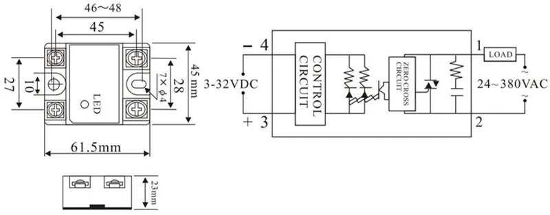 Модель SSR-40DA Контроль постоянного тока в переменный ток Ток нагрузки 40А Регулируемое напряжение 3-32VDC Максимальный входной ток 12 мА Должно быть рабочее напряжение 2.8VDC Должно высвобождать напряжение 1.5VDC Напряжение нагрузки 24-380VAC Пиковое напряжение 800 в Рабочая температура-30 ℃ до 80 ℃ Максимальный выходной ток утечки 2ма Максимальное напряжение в открытом состоянии падение 1,5 V Диэлектрическая сила 2500 В Сертификаты CE Размеры (мм) 61.5L x 45W x 23H Вес 100 г