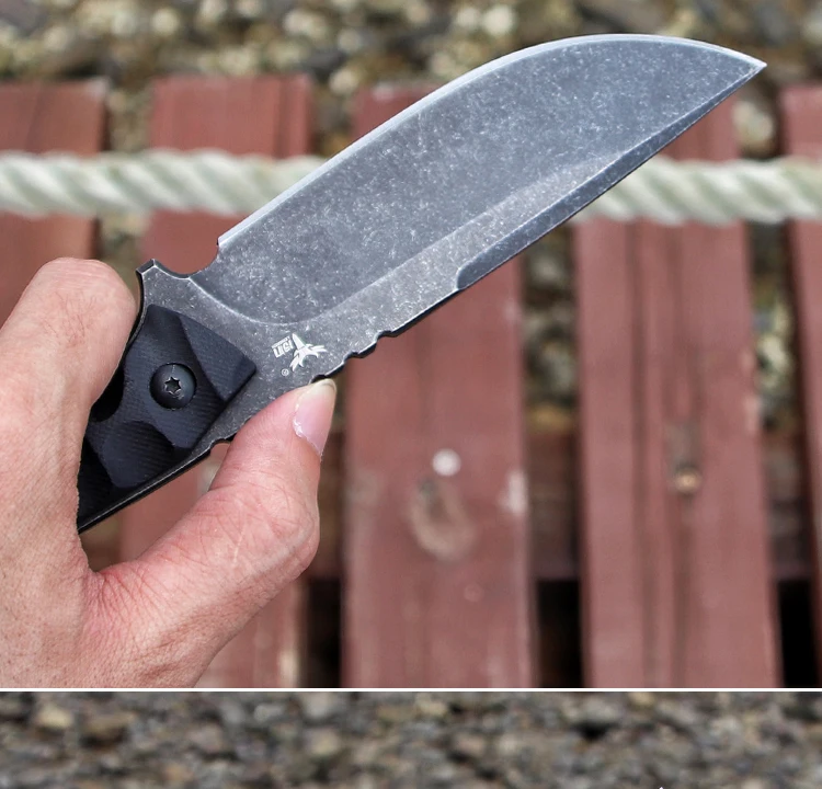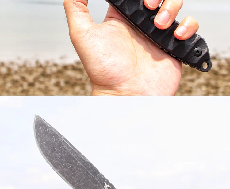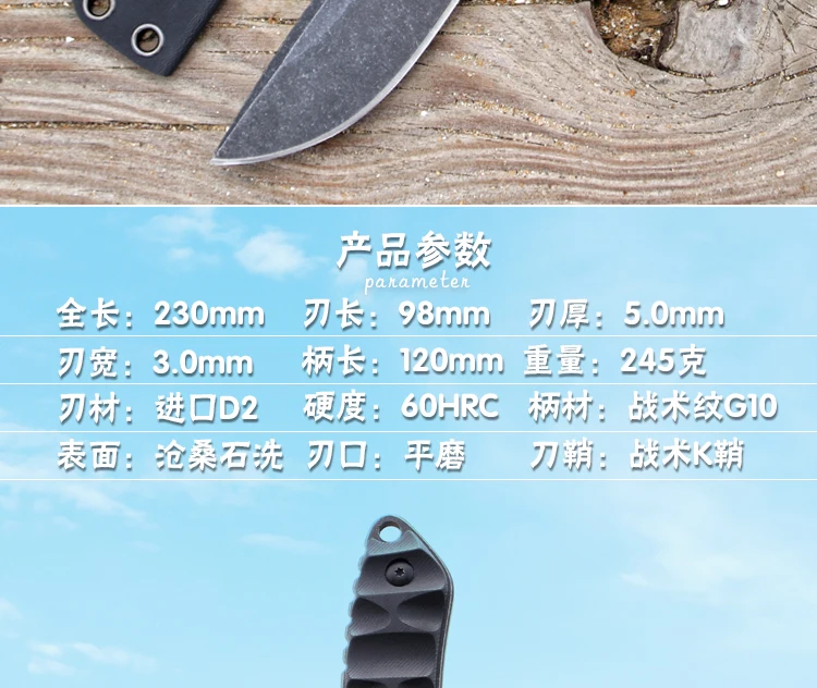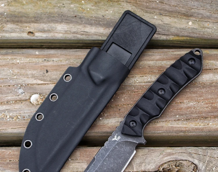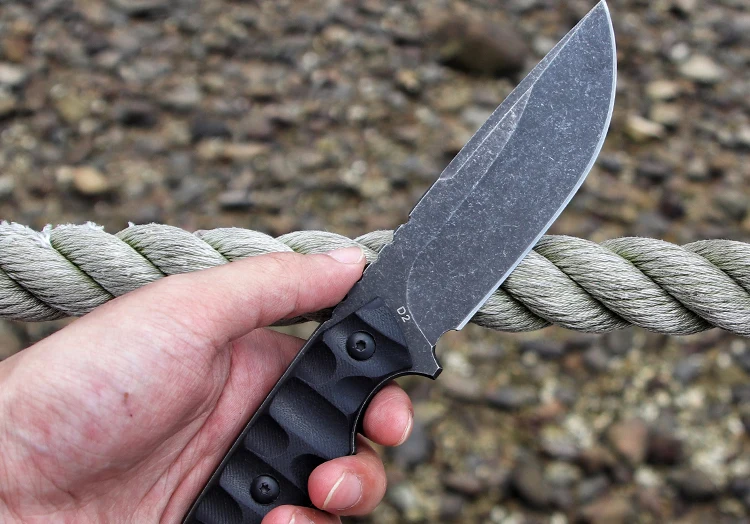 Общая длина: 23 мм, Лезвие: 9,8 см в длину, Толщина лезвия: 5 мм, Ширина лезвия: 30 мм, Сталь: D2 Твердость: 59-60 (вакуумная Термическая обработка) Обработка поверхности: каменная стирка Материал ручки: G10 Оболочка: kydex!