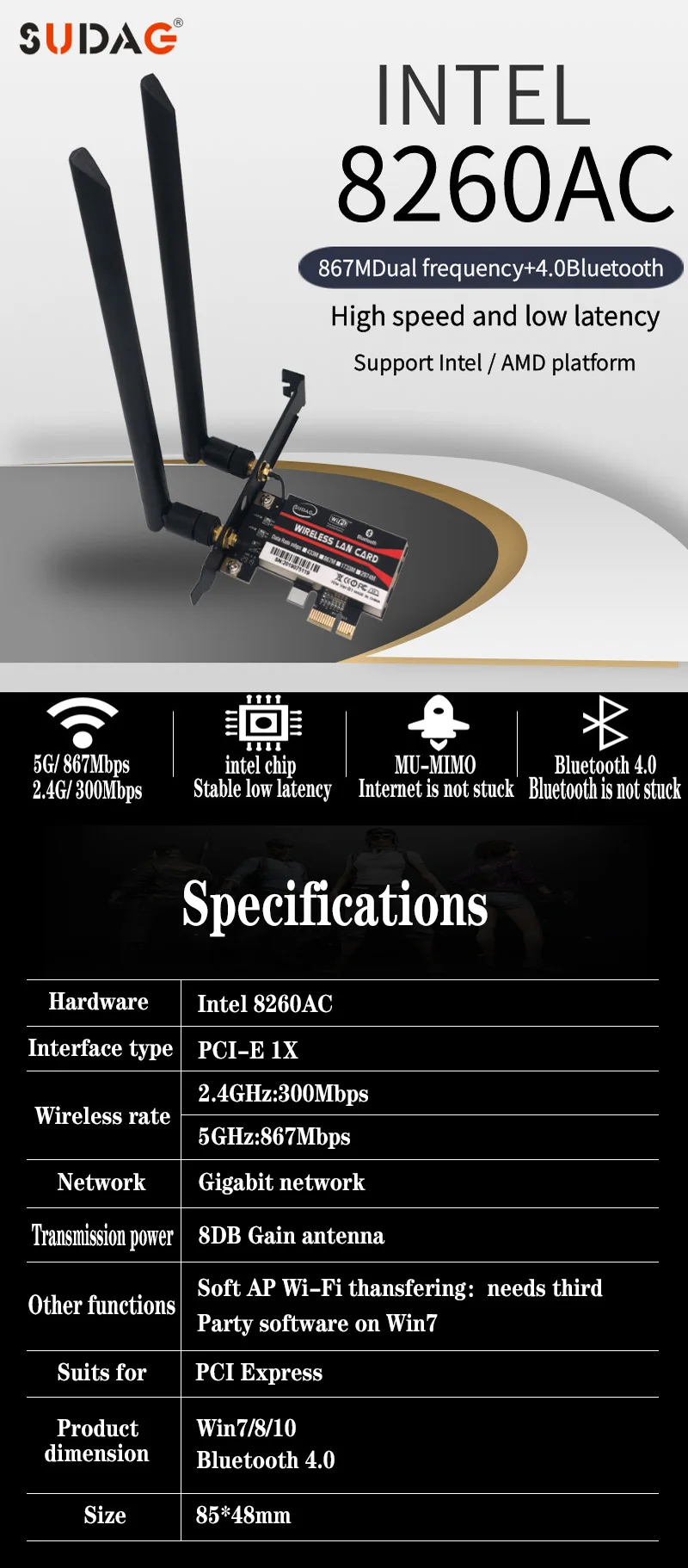 Марка: sudag Modelo: SD-8260AC adaptador Wi-Fi de escritorio (ver detalles) Цена: intel 8260AC Maga barato Estandar ieee: 802 11ac С Bluetooth 4,0 Banda doble 2,4 ГГц-300 Мбит/с/5ghz-867mbps Nota: velocidade de hasta867 Мбит/с (roteador el debe admitir 802.11ac) Sitemas operativos: admite individualnyy windows 7/8/10 Описание: ordenador casi con pci express (ranura pci-e 1x/4x/16x) intertaces
