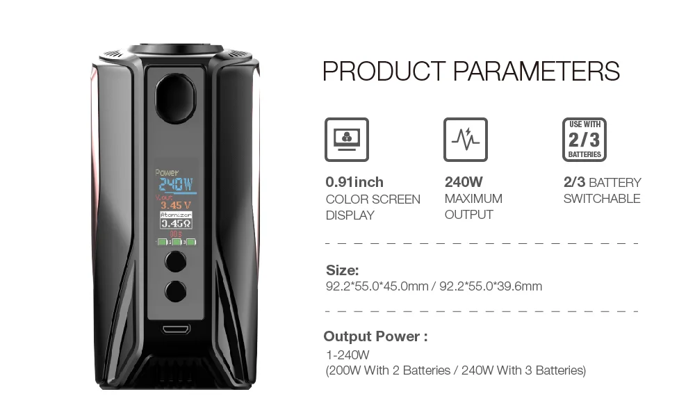 1. Тип: Набор N1 PRO 240W 2. Размеры: 92,2*55*45/39,6 мм 3. Размер экрана: 0,91 TFT дисплей 4. Режим выхода: VW / Bypass / TC 5. Емкость: 18650*3 (не входит в комплект) 6. Выходная мощность: максимум 200 Вт 7. Диапазон сопротивления: 0,05-2.0ohm 8. Usb-зарядка для тока: 5 В/1 а постоянного тока 9. Цвета: черный и красный, черный и золотой, белый и красный, белый и золотой Примечание: аккумуляторы 18650 в комплект не входят