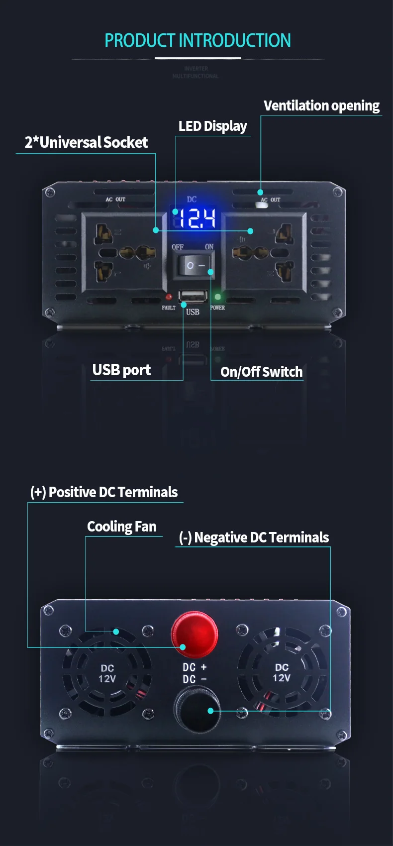 Интеллектуальный контроль температуры и меньше тепла. Этот инвертор питания принимает высокое в качественном алюминиевом корпусе и это встроенный тихий вентилятор контроля температуры, когда инвертор начинается, вентилятор запустится автоматически. Когда инвертор получает более высокую температуру, вентилятор будет работать быстрее, чтобы получить высокоскоростное тепловыделение.