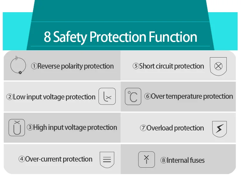 Полная защита. Встроенная защита от перегрева, защита от перегрузки, защита от низкого напряжения, защита от перегрузки по току, защита от перезаряда, защита от разрядки и защита от короткого замыкания, безопасная и надежная.