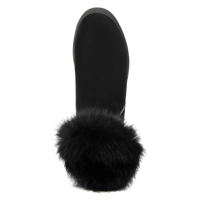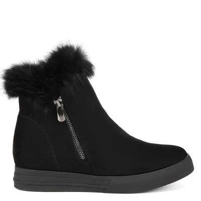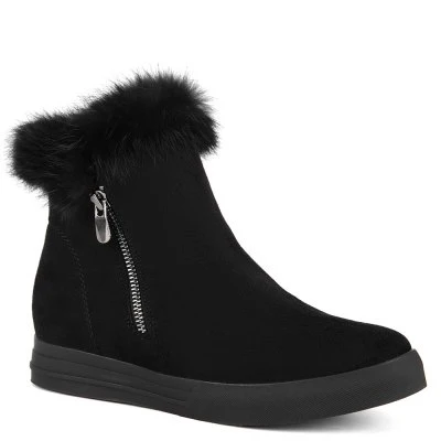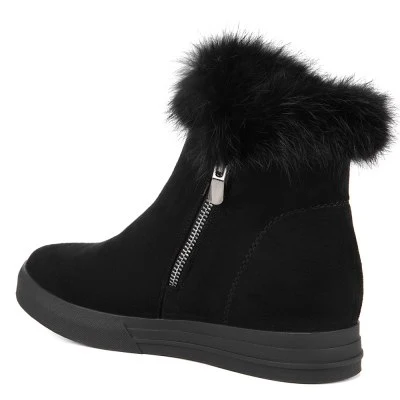 Ботинки выполнены из искусственного материала. Благодаря сплошной подошве ноги в этой обуви не будут уставать на протяжении всего дня. Модель чёрного цвета с округлым мыском. Обувь украшена опушкой из натурального меха. В качестве подкладки использован искусственный мех.