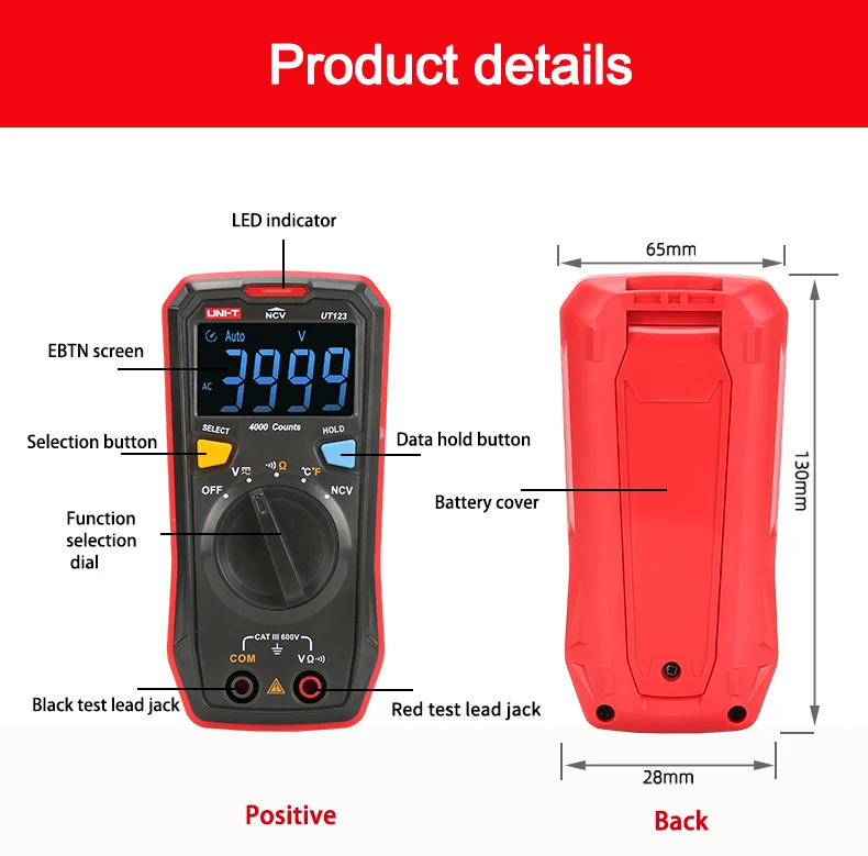 UNI-T Автоматический диапазон мини цифровой мультиметр температурный тест er UT123 Удержание данных AC DC Вольтметр Карманный Напряжение Ампер Ом метр HD EBTN цветной экран мини размер, портативный, высокая точность бытовой мультиметр, разработан специально для DIY пользователей Функция: AC напряжение, напряжение постоянного тока, сопротивление, непрерывность, °C/°F температурный тест, NCV, сигнализация, полная защита диапазона