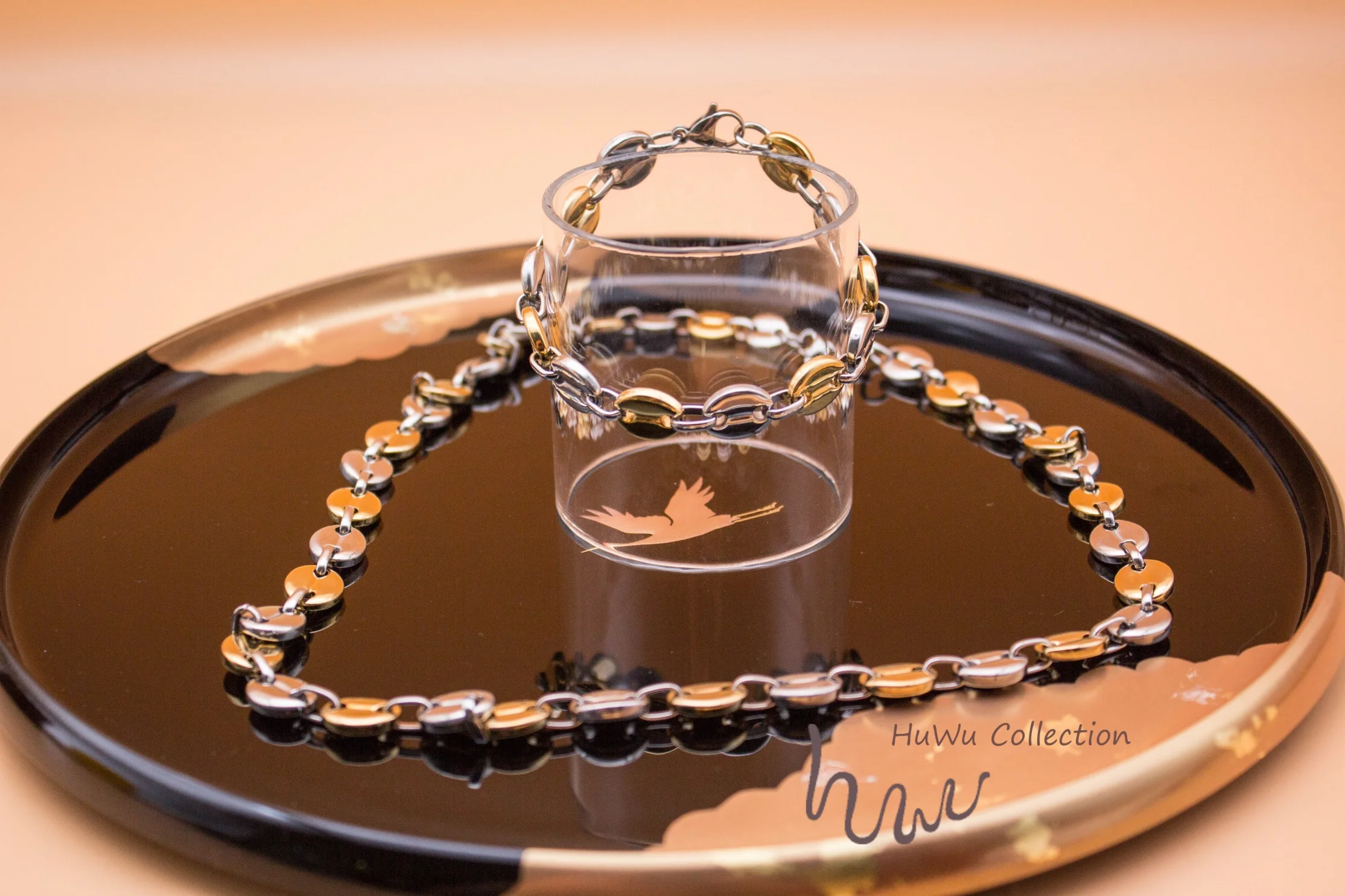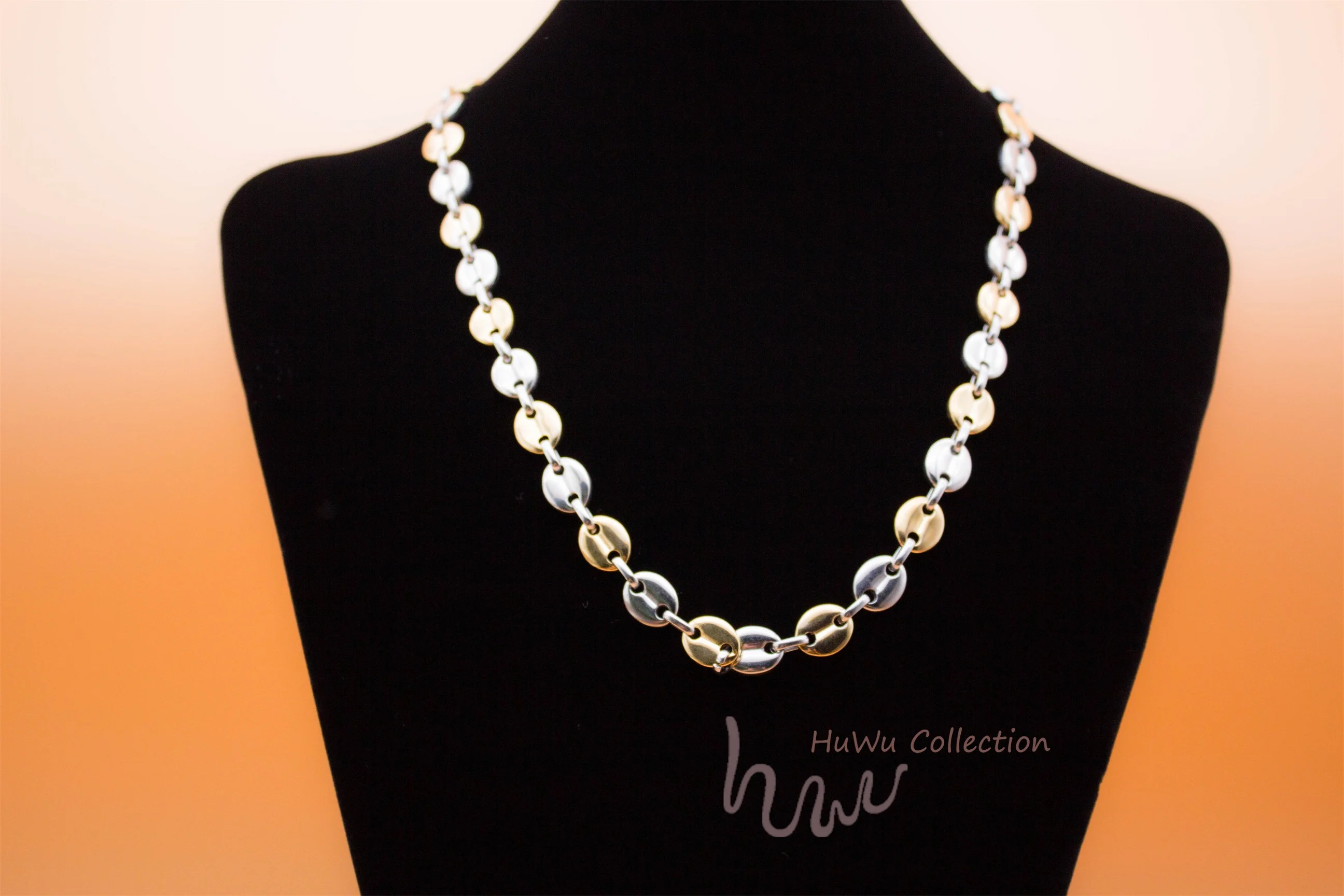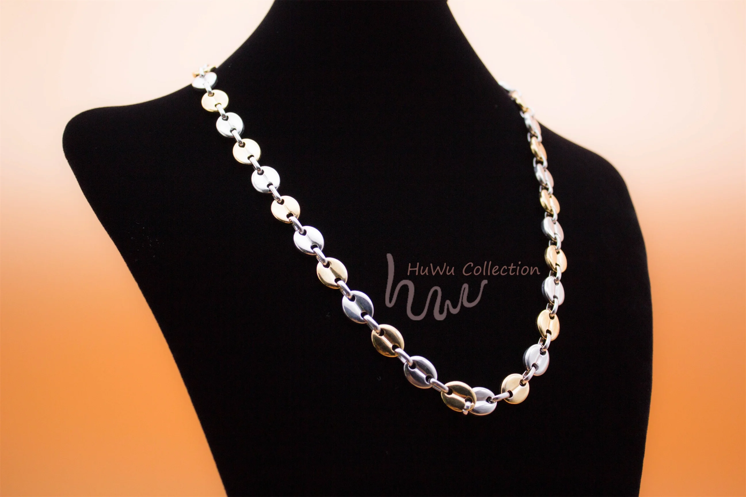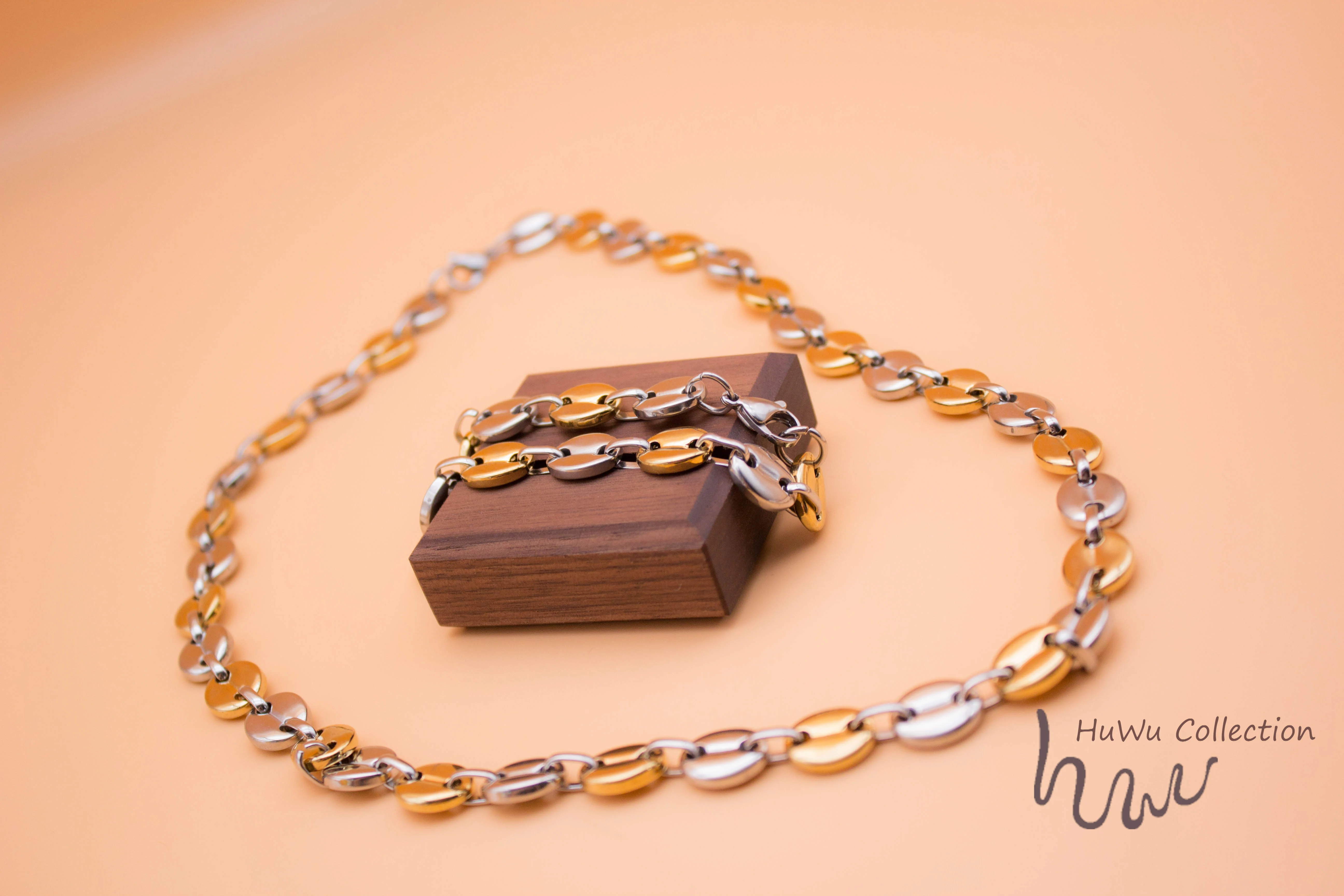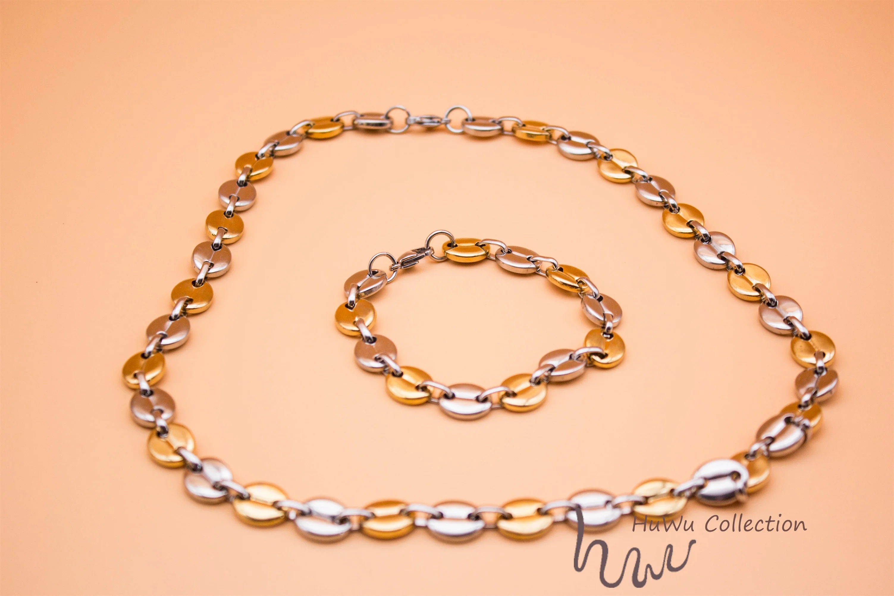 Набор аксессуаров, здесь вы найдете браслет и ожерелье. В двух оттенок цвета Серебро и золото. Уникальный Кофе цепочка в форме бобов, совмещенный дальний/хип-хоп Стиль для всех полов. Высокое качество 18k золото чёрно-покрытые золотом гипоаллергенный браслет из нержавеющей стали, придает этим набором аксессуаров Стойкий цвет.