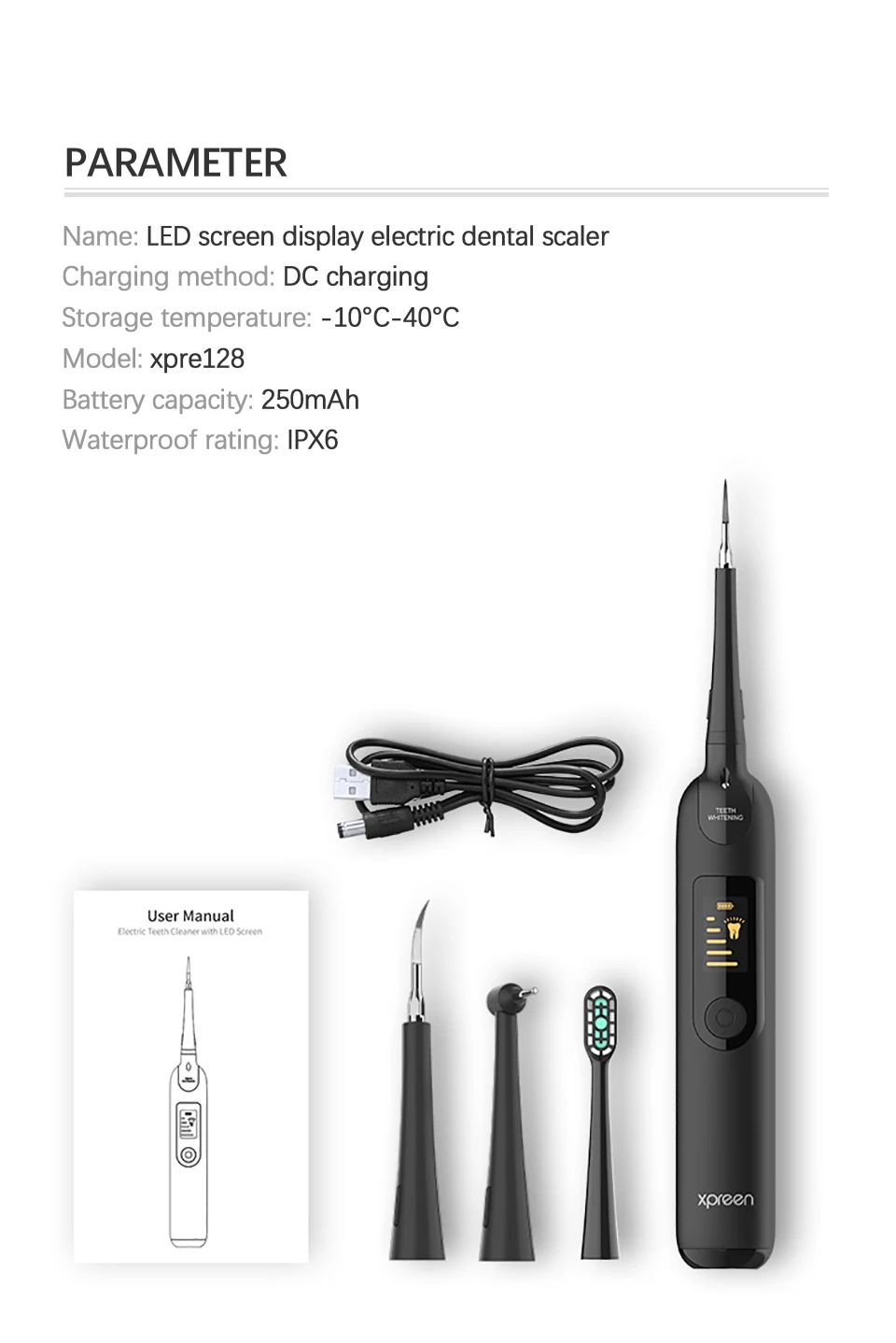 | . Светодиодный экран Электрический Стоматологический Скейлер * 1 . Usb-кабель для зарядки * 1 . Руководство на английском языке * 1 . Чистящая головка в форме крючка . Плоская чистящая головка крючка . Головка для чистки зубной щетки |