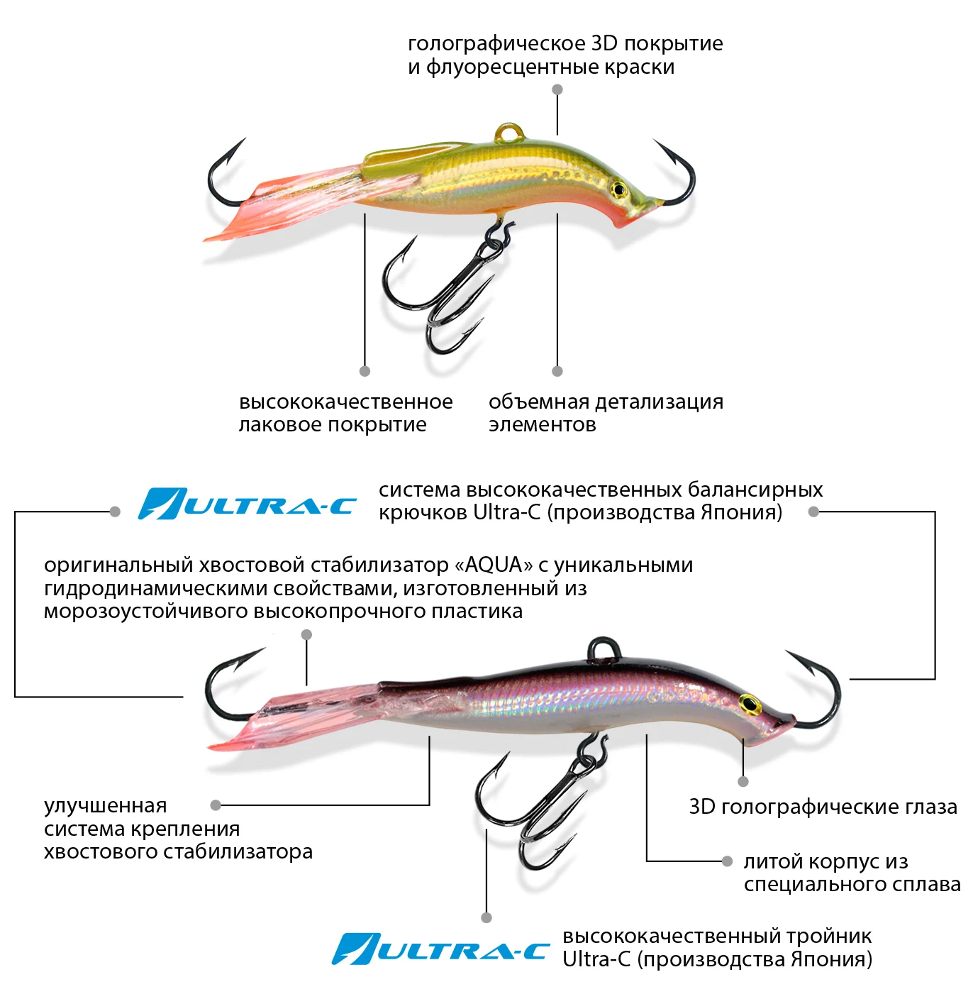 Приманка оснащена системой высококачественных балансирных крючков и тройником Ultra-C (производства Япония), безупречная заточка которых не оставит рыболова без улова.