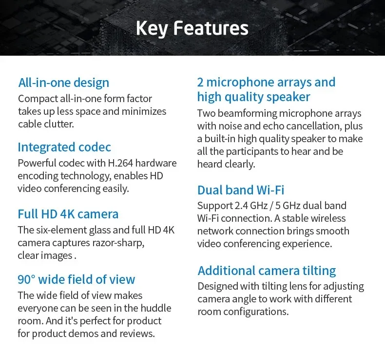Тип: система видеоконференции Функция: видеоконференции, беспроводной обмен, доска, видеозвонки и видеоконференции, беспроводной обмен, доска Синхронный перевод: нет Место происхождения: Гуандун, Китай Название: Android все-в-одном видео конференц-оборудование Поддержка: программное обеспечение для видеоконференций Skype /Zoom и т. д. Аудио: Встроенный микрофон и динамик Кодирование видео: H.264, VP8 ЦП: четырехъядерный Cortex-A17, 1,8 Гц Видеовыход (HDMI): 1920x1080 @ 30 кадров в секунду Горизонтальный/вертикальный угол обзора: 90 °, 53 ° Другие: OEM/ODM проекты приветствуются Размер одной посылка: 34х14х11,5 см Один вес брутто: 2,000 кг