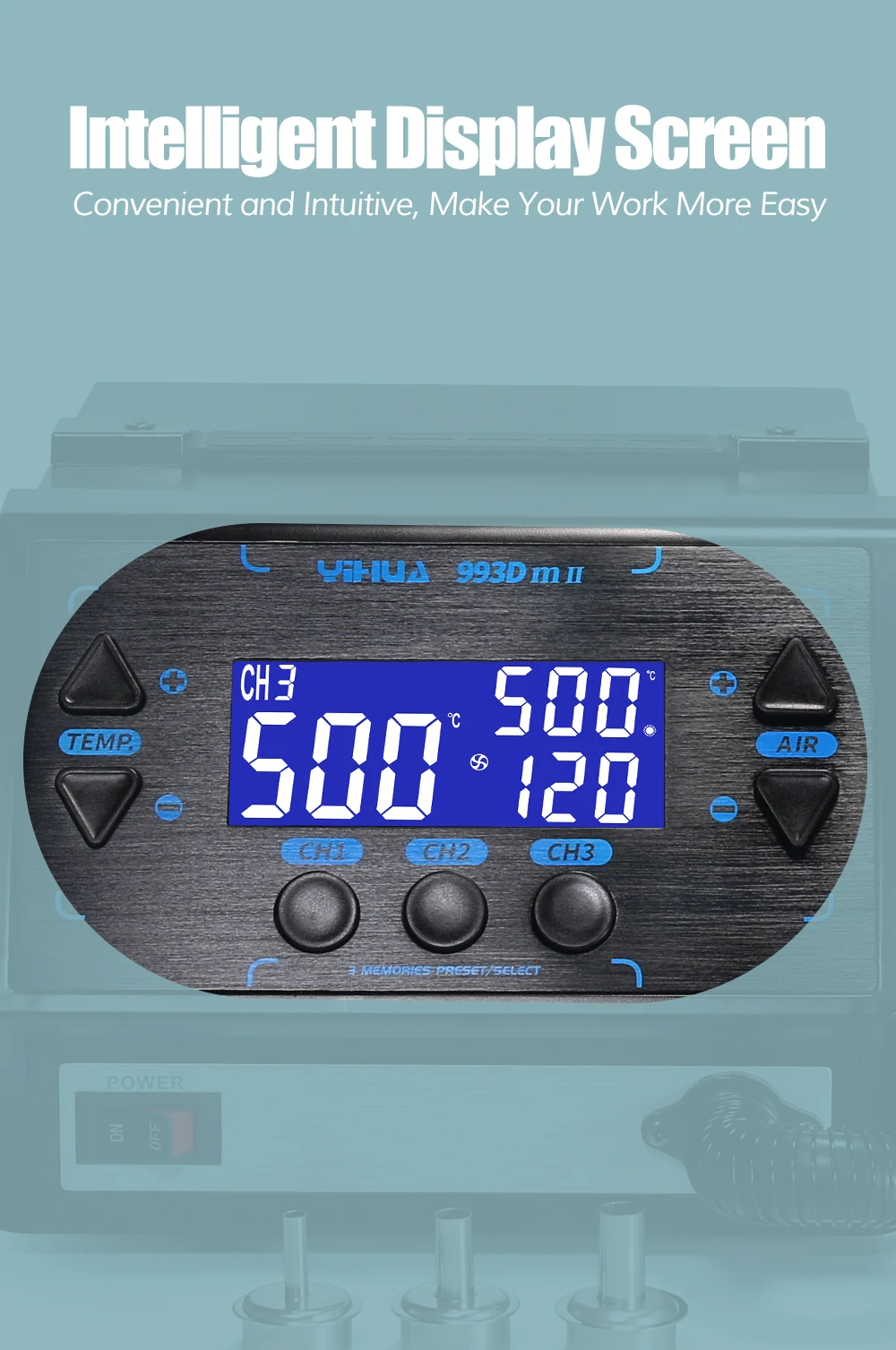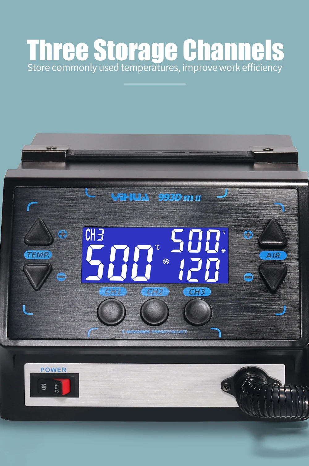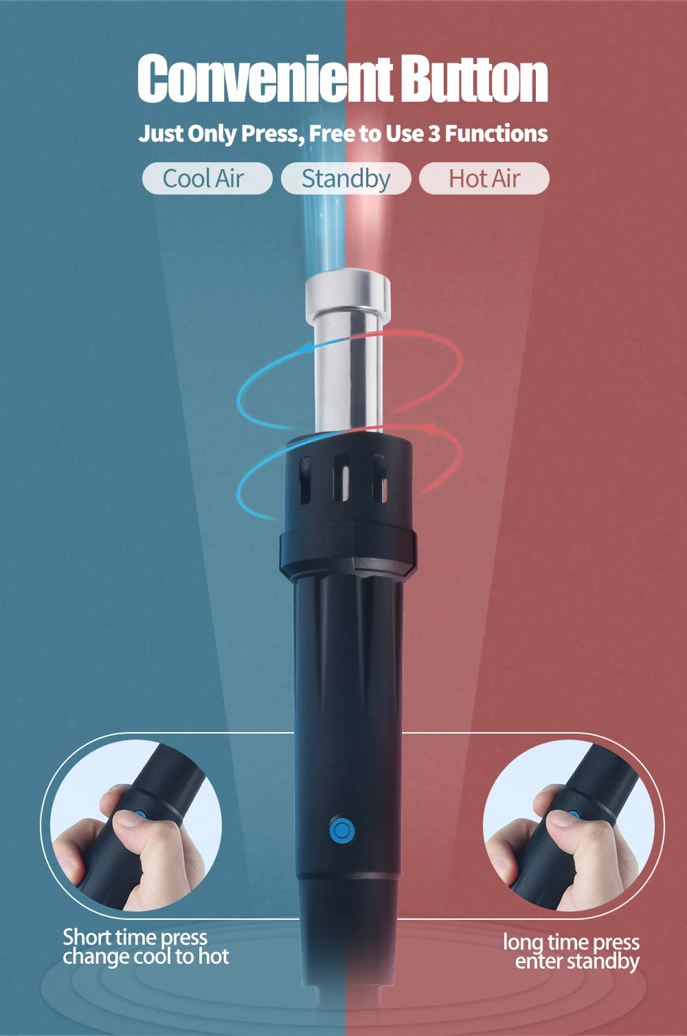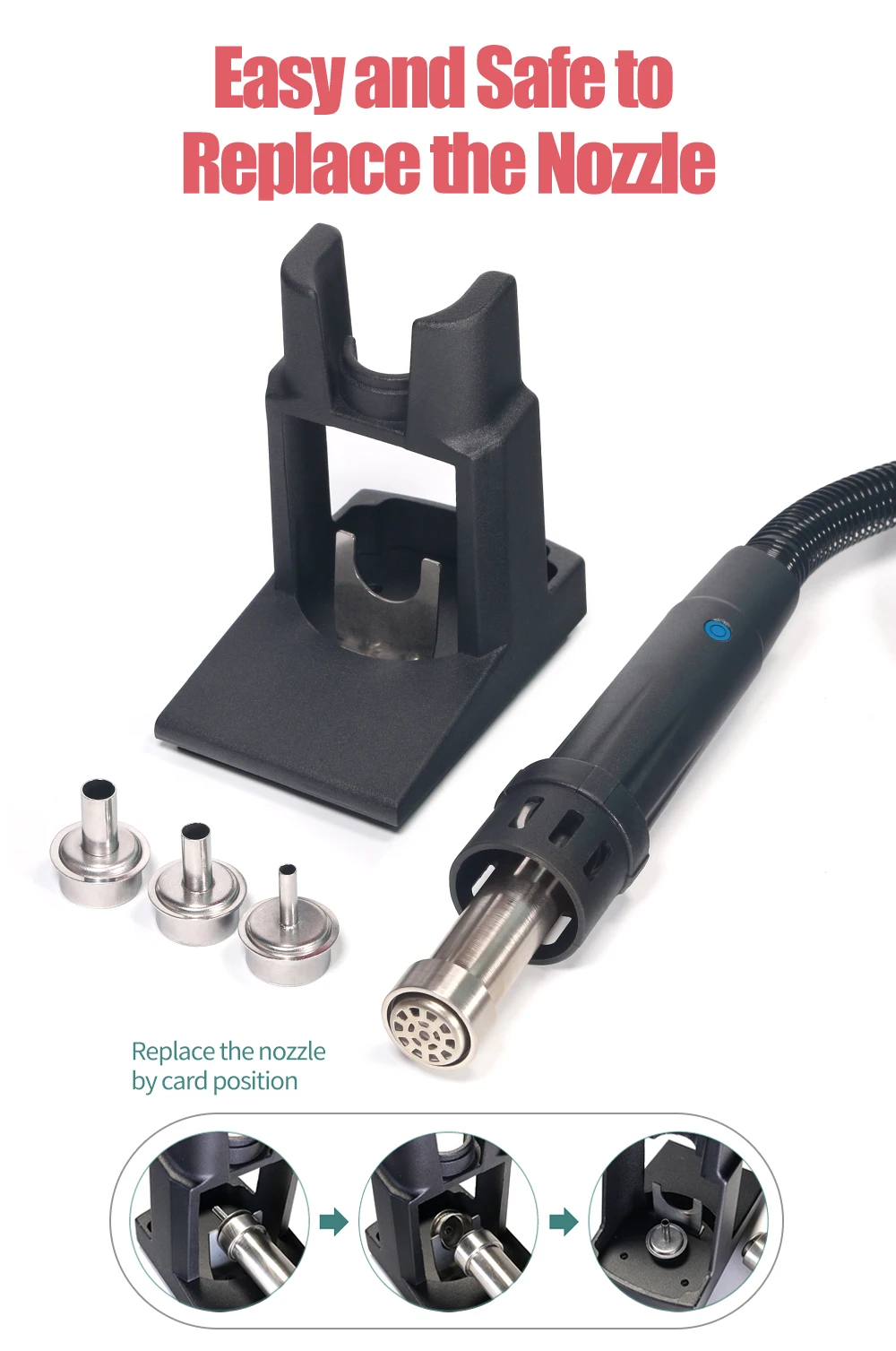 1. На ручке воздушного пистолета есть кнопка регулировки температуры. Вы можете установить холодный воздух, стоять, горячий воздух этой кнопкой2. Режим температуры F/C3. Коррекция температуры4,3 presets memories CH1 CH2 CH3 для хранения температуры и воздушного потока