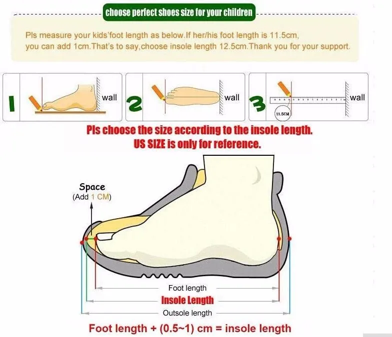 Длина стопы + 1 см = Внутренняя длина. Пожалуйста, измерьте длину стопы вашего ребенка, как показано ниже. В том случае, если ее/его, что соответствует длине стопы в 11,5 см; Вы можете добавить сюда свой 1 см. Что сказать, выбирайте внутренняя длина 12,5 см. Спасибо за вашу поддержку.