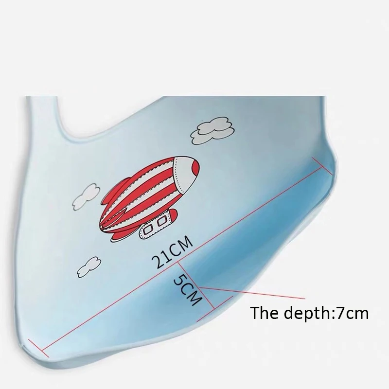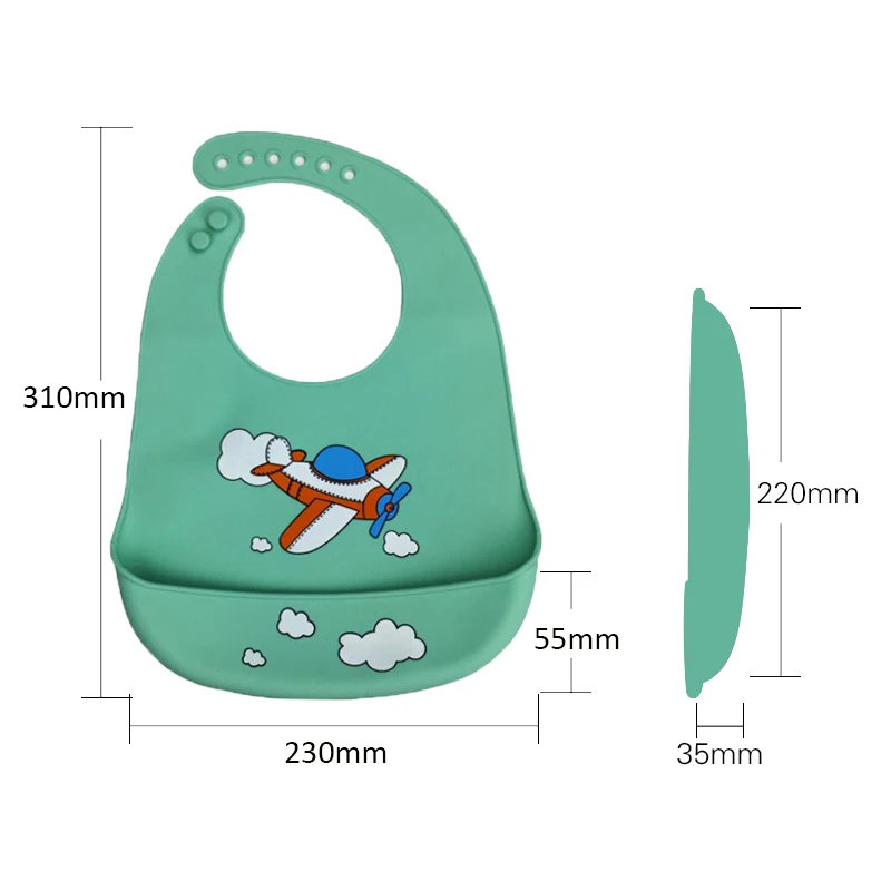 Размер: 23 см * 30 см Материал: пищевой силикон Возраст: от 0 до 3 лет Пол: унисекс Упаковка: 1 шт. нагрудник Особенности 1. 100% новый бренд, высокое качество 2. Милый узор 3. Подходит для повседневной носки ребенка 4. Защелкивающаяся конструкция, регулируемая, легко надевается и снимается 5. Избегайте влажной одежды со стороны слюны ребенка