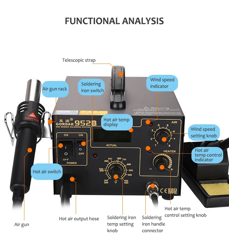 Паяльная станция Micro Rework, светодиодный фен для волос 952B двойного назначения, Антистатическая паяльная станция горячего воздуха