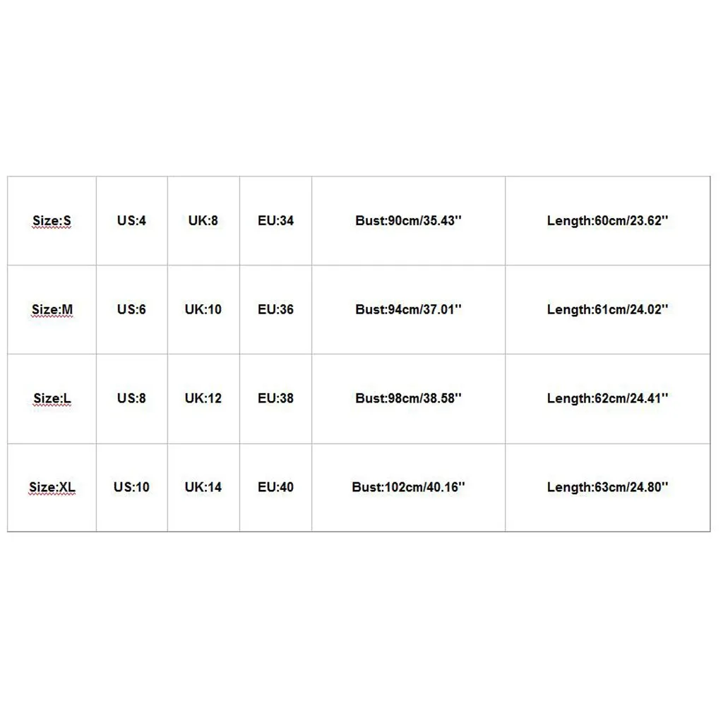 | Size:S | US:4 | UK:8 | EU:34 | Bust:90cm/35.43'' | Length:60cm/23.62'' |