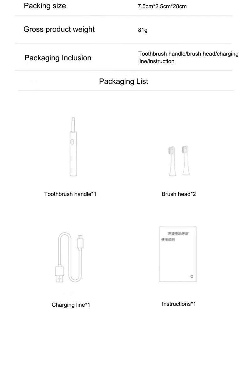 Модель: Стандартный Чистый/мягкий чистый/чувствительный резиновый щит Емкость батареи: литиевая батарея 500 мА Частота: 22000 раз/мин Номинальный Вход: 5 В постоянного тока 0.5A Номинальная мощность: 1 Вт Номинальное напряжение: 3,7 V Время зарядки: около 3 часов Срок службы батареи: около 35 дней Модели зарядки: 3 режима, зарядка около 35 дней Конфигурация: Хост зубной щетки * 1, головка зубной щетки * 2, зарядный кабель * 1, упаковочная коробка/руководство по эксплуатации * 1 Размер упаковки: 7,5*2,6*20,8, весь вес: около 97,6 г Размер блока: 22 см * 1,97 см