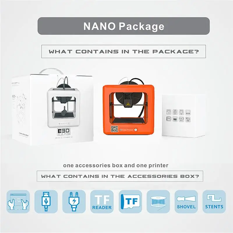 Easythreed NANO 3D принтер является потребительским 3D принтером. Он полностью собран (поэтому сборка не требуется). Также он поставляется с собственным программным обеспечением для нарезки (E3D NANO), которое было специально изготовлено для этой модели и имеет уникальную функцию автоматического нарезки, основанную на ваших предпочтениях по времени и качеству.