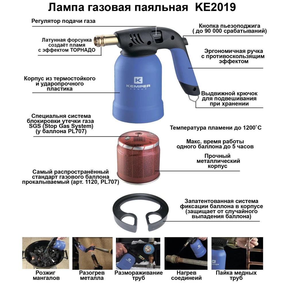 Предназначена для различных монтажных и строительных работ, например: для пайки медных, латунных, бронзовых труб; отогрев замерзших деталей, замков, водопроводных труб, фитингов; нагрев лакокрасочных и напольных покрытий, для их удаления; обжиг древесины; розжиг костра, угля, печей, камина и мн.др. Оснащена системой пьезоподжига, регулировкой пламени. Комплектация: поставляется без баллона.