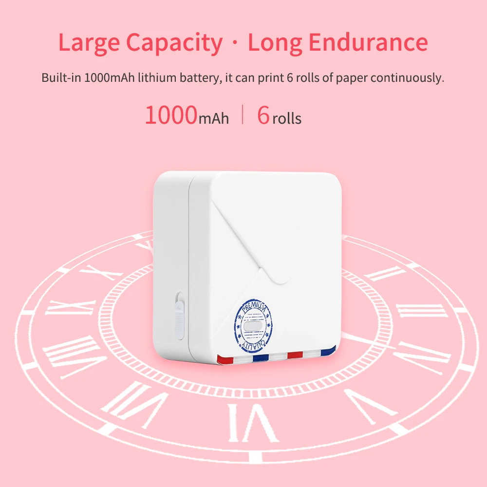 Долгий срок службы:Встроенный литиевый аккумулятор емкостью 1000 мАч, зарядка через USB, после полной зарядки может печатать 6 рулонов бумаги, провода не требуются, печать в любое время и в любом месте.