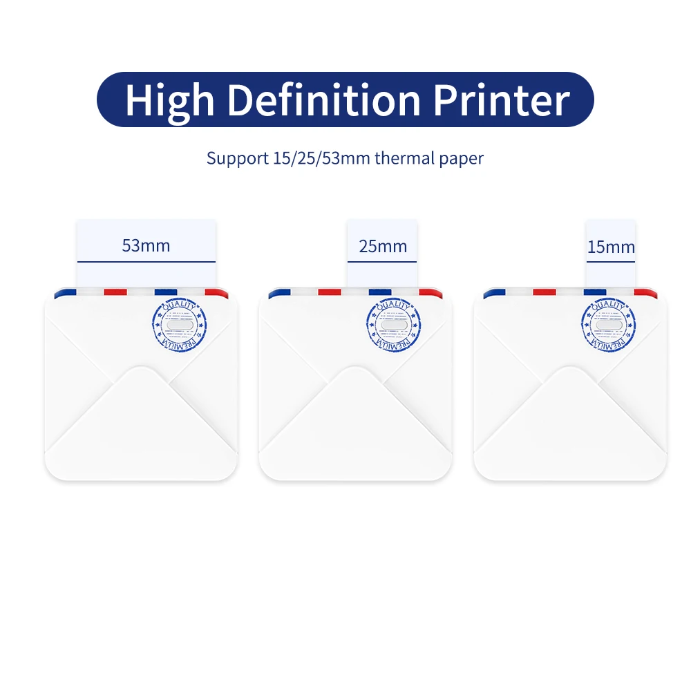 Карманный принтер:Компактный и простой, как маленькая квадратная книга, удобная для переноски. 300 точек/дюйм печать высокой четкости, 15-53 мм ширина бумаги, хорошая и четкая печать эффект.