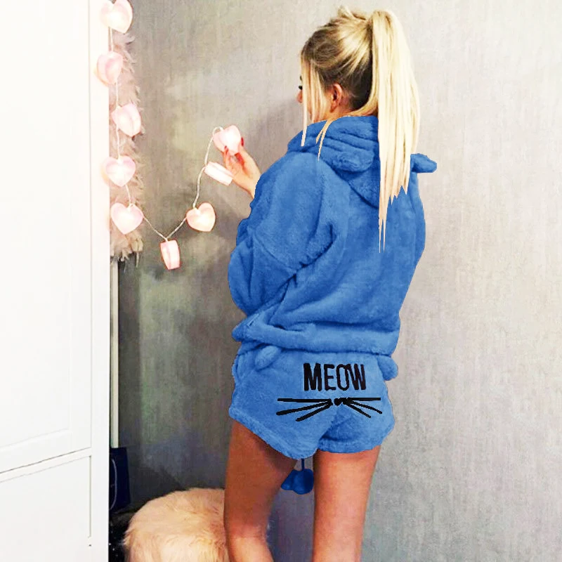 Модный женский зимний теплый Пижамный костюм, Женская плюшевая толстовка, топы с длинным рукавом и шорты с милым мультяшным рисунком кота, 2020