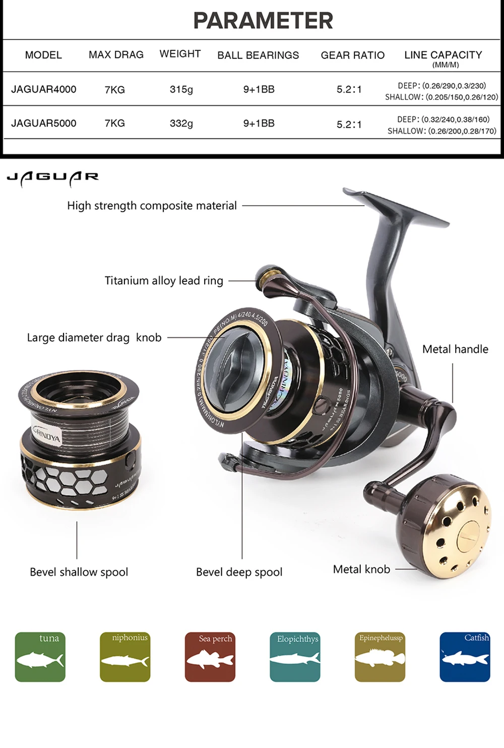Рыболовный спиннинг TSURINOYA Jaguar 4000 5000, катушка фидерная для соленой воды с металлической ручкой, с большой ручкой, 2 катушки, 9 + 1 шарикоподшипников, 7 кг, макс. 5,2: 1, колесо для ловли карпа и щуки