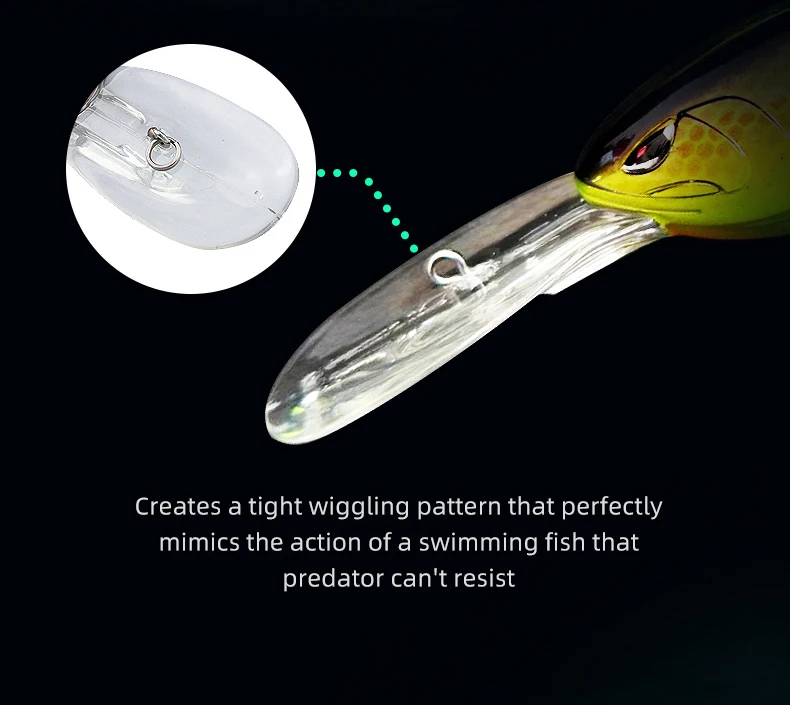 Массивная длинная накладная помогает быстрее достичь глубины и увеличить вибрацию приманки, создает плотный узор, который идеально имитирует действие плавающей рыбы, которой Хищник не может сопротивляться