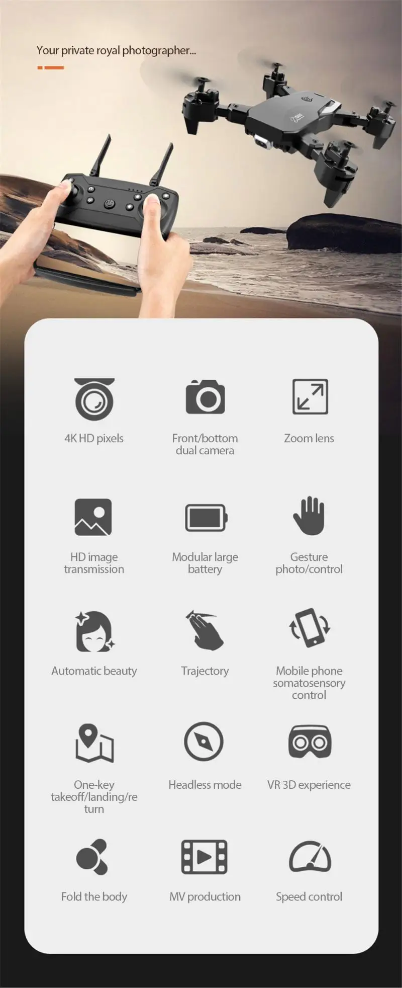 -4K пикселей, съемка с двойным переключателем камеры, фронтальная камера и нижняя камера могут быть переключены с помощью пульта дистанционного управления, что дает вам другой угол обзора, диапазон съемки значительно улучшен.