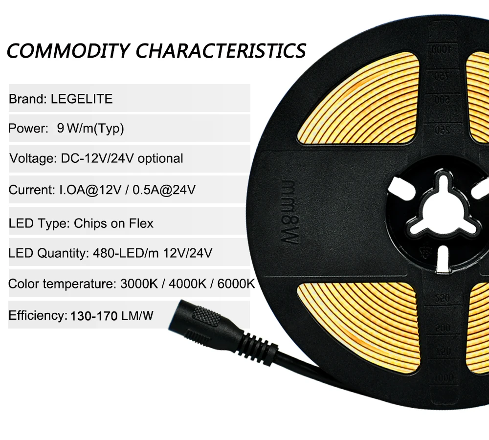 Вход Напряжение: DC12V /24V Мощность: 8 мм-9 Вт/м Ширина: 8 мм Количество СВЕТОДИОДНЫЙ: 480 светодиодный s/M Длина резки: DC12V (25 мм)/ DC24V (50 мм) Цветовая температура: теплый белый (3000K), натуральный белый (4000K), холодный белый (6000K). Индекс цветопередачи: Ra>90 Рабочая температура: -25 ℃-+ 60 ℃ Температура хранения: -40 ℃-+ 80 ℃ Угол обзора: 180 °