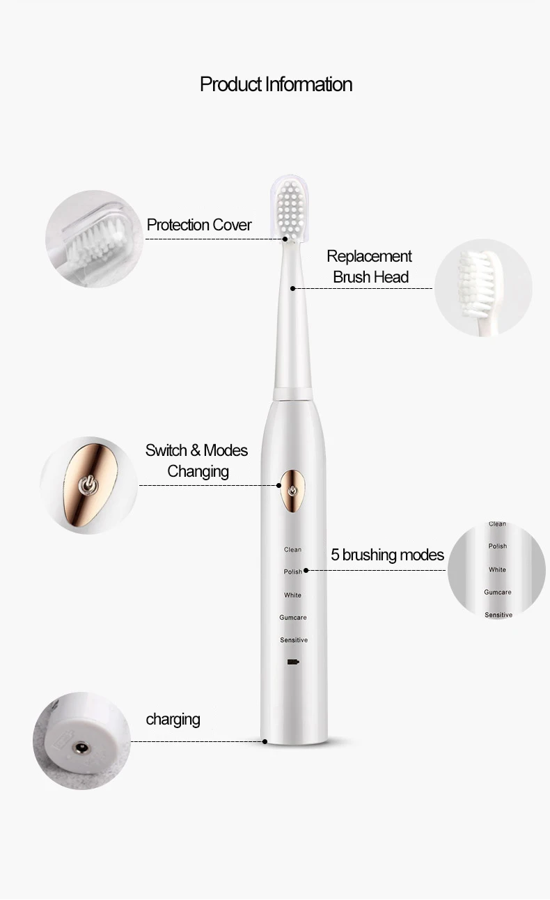 5 высокопроизводительных режимов чистки Подходит для различных условий зубов и десен 1. Режим очистки: Удалите налет; 2. Режим полировки: для полировки передних зубов; 3. Белый режим: для глубокой очистки, отбеливания зубов 4. Gumscare: массируйте десны. 5. Чувствительный: для чувствительных зубов.