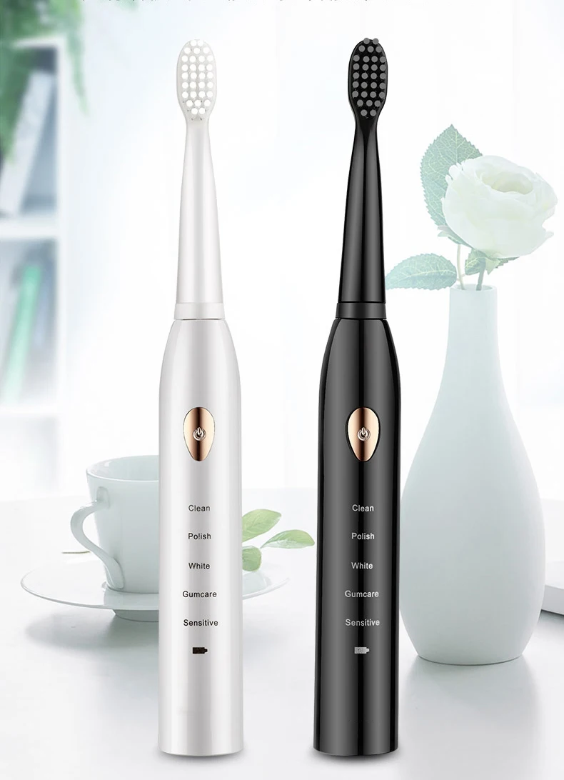 Уведомление Скидка 2% на 2 шт. Поддержка Прямая доставка и оптовая продажа! Большой заказ, большие скидки! Посылка включает в себя: (без коробки) 1 x ручка для зубной щетки 4 головки зубной щетки 1 зарядное устройство USB Звуковая зубная щетка, уход за зубами Звуковая технология, таймер 2 минуты, водонепроницаемость IPX7, 5 режимов очистки
