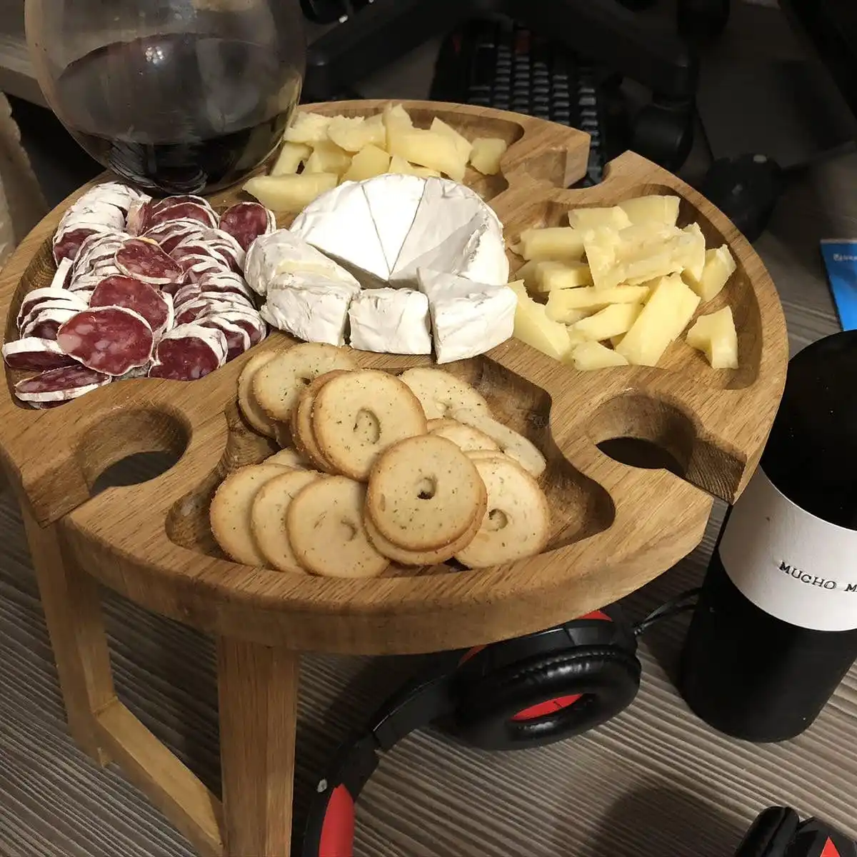 Wine table is great for holding a evening at a company of close people, or a gift to an expensive person. Mobile, lightweight and compact. A special design fixes glasses, which allows you to use them even on uneven surfaces. Ideal for picnics and at home.