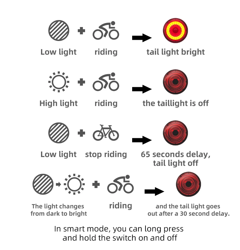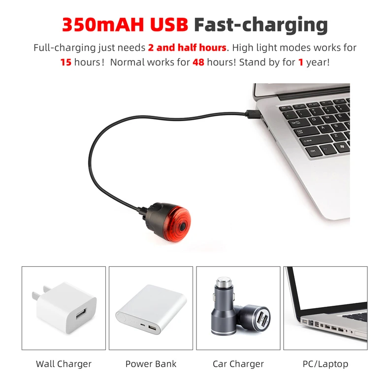 Встроенный полимерный литиевый аккумулятор емкостью 350 мАч поставляется с usb-шнуром, который заряжается от вашего компьютера, настенного зарядного устройства, внешнего аккумулятора или любого другого устройства с usb-портом. После зарядки в течение 2-3 часов, велосипед хвост светильник может работать в течение 15-48hours в различных режимах.