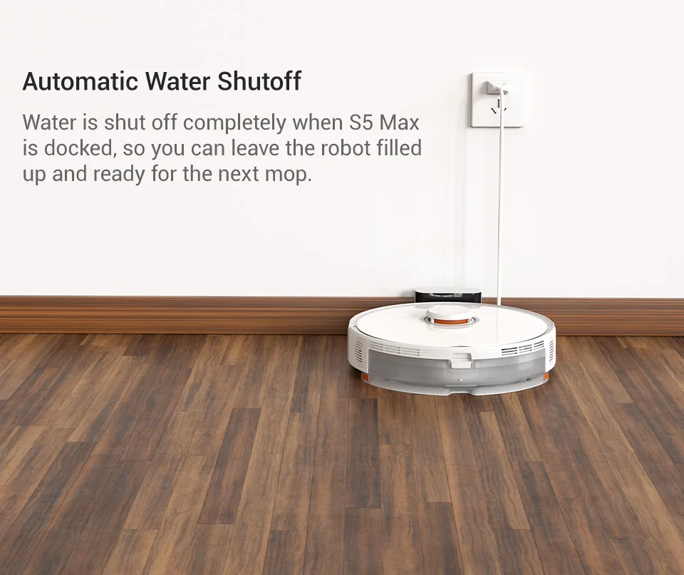 Вода полностью отключается, когда S5 Max приклеивается, поэтому вы можете оставить робота заполненным и готовым к следующей шваброй.