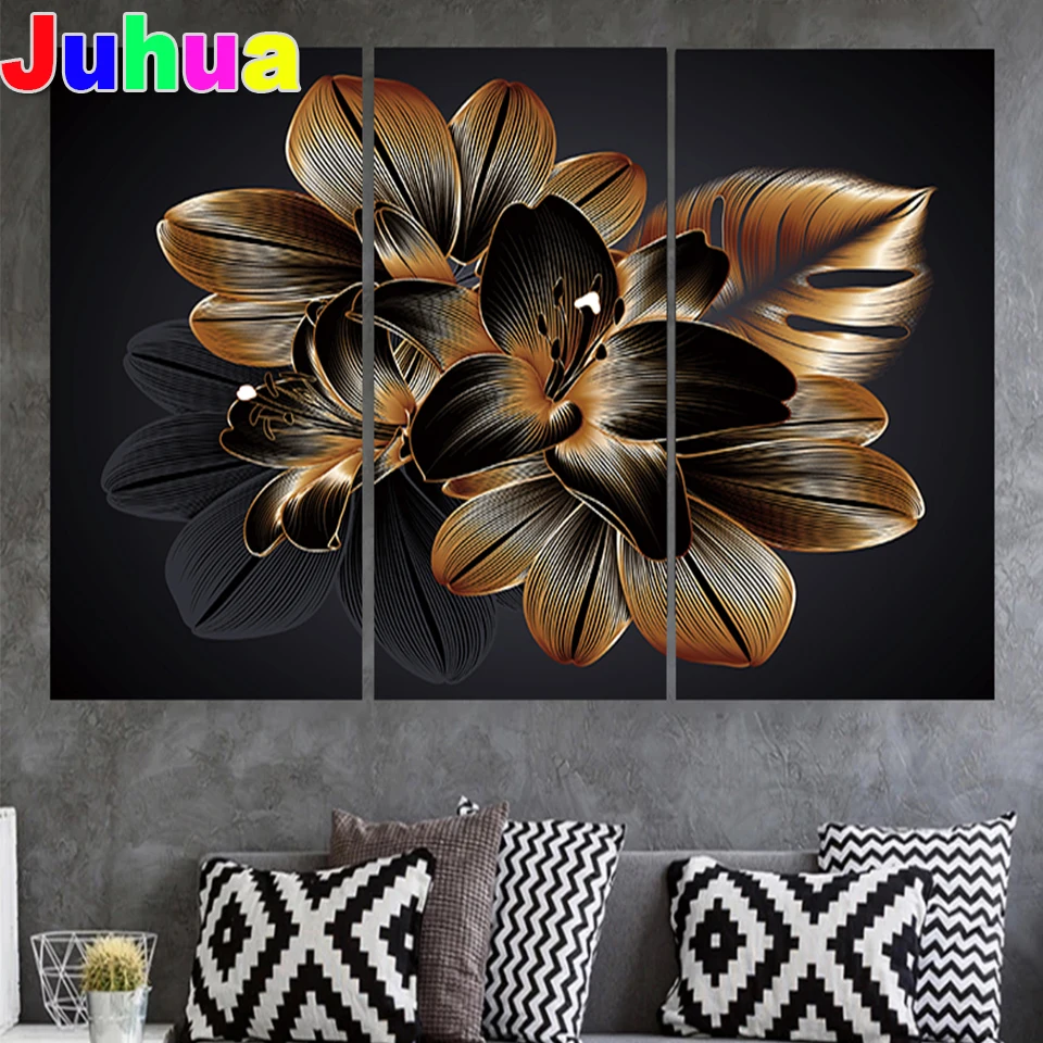 Full Square Round Drill Diamond Embroidery Golden Lily Flowers 5D Diy Diamond Painting Mosaic Abstract art Triptych Home Decor