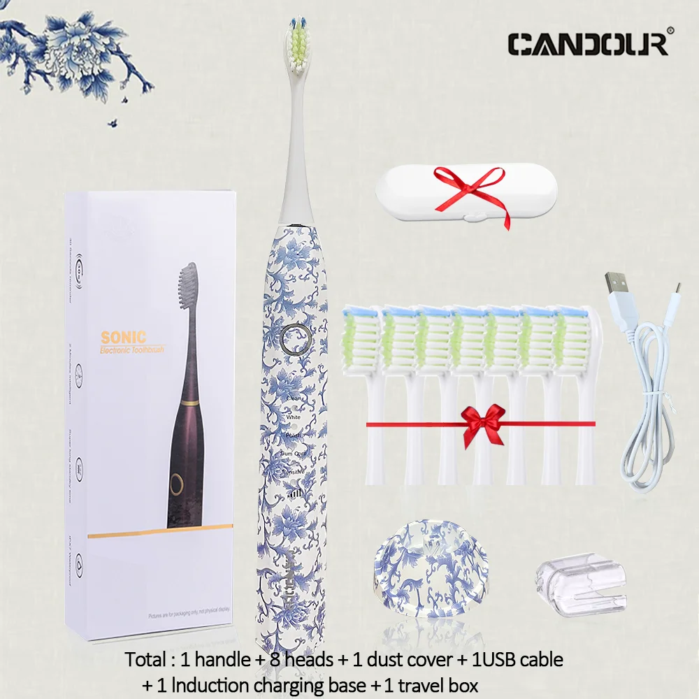 Chinese style Blue and white pottery Sonic Electric Toothbrush USB Rechargeable Toothbrush with 8 Brush Head IPX7 Waterproof