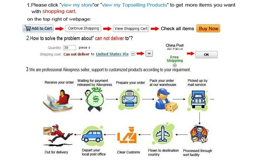 1. Мы отправляем товар по вашему адресу на Aliexpress. Перед оплатой заказа убедитесь в правильности адреса вашего Aliexpress.